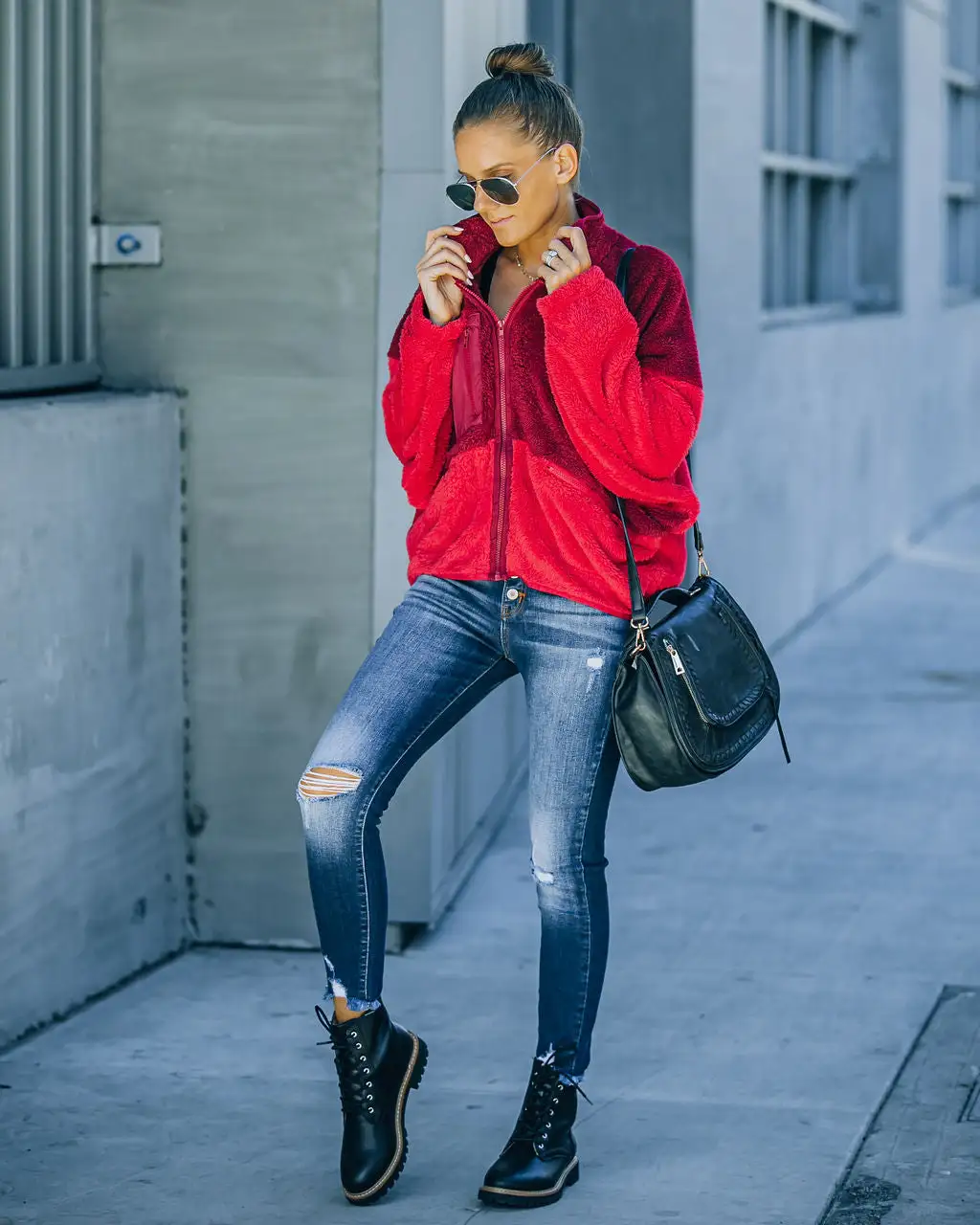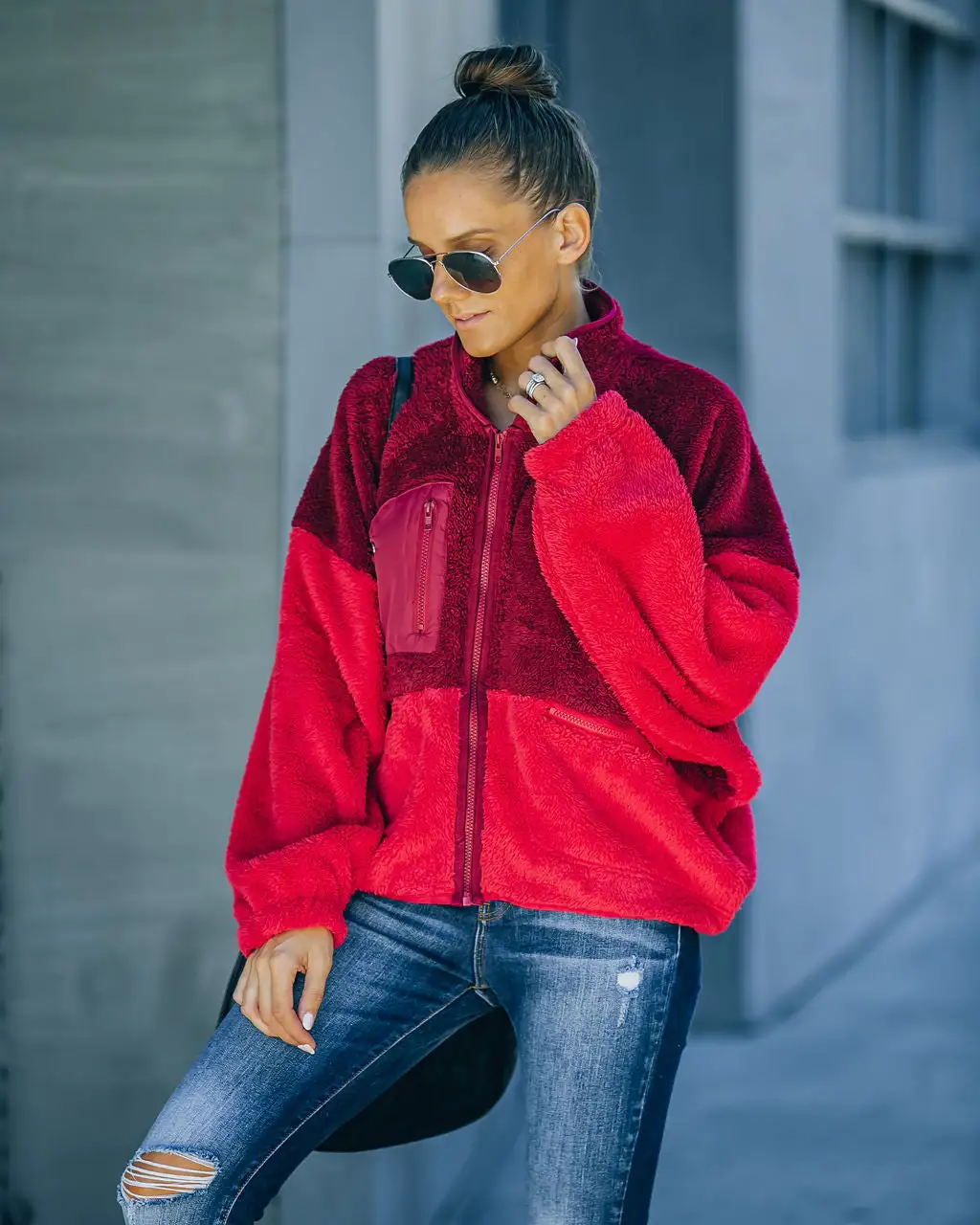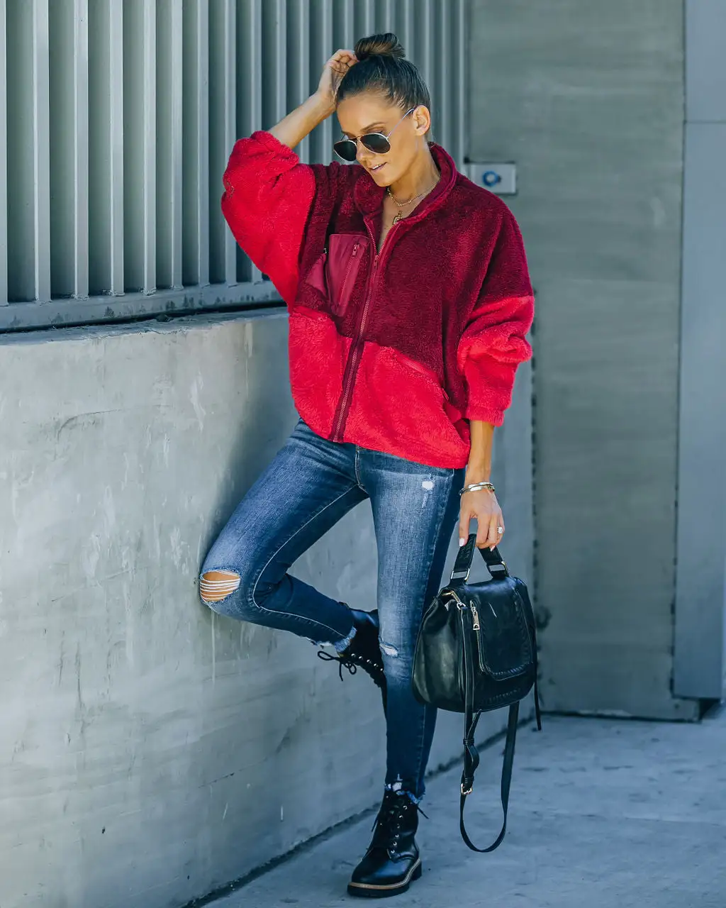 Colorblock jackets add flair and fun to dreary winter days! Our Nava Pocketed Colorblock Zip Up Jacket features wine and red hues. This fuzzy piece is secured with a front zipper closure. Styled with the Chloe Mini Necklace, Initial Card Necklace, Simple Bangle Bracelet, Highland Bag, Tilley Frayed Ankle High Waisted Skinny, and Brycen Faux Leather Lace Up Boot.