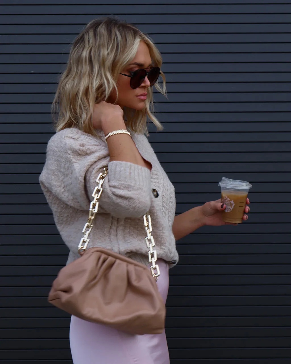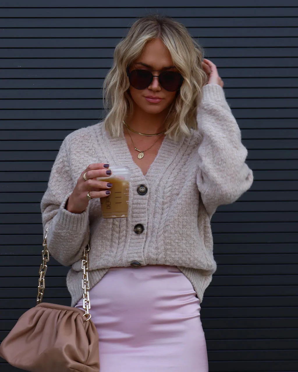 We’re making cold weather dressing fun with our Never Lonely Oversized Button Front Cardigan paired with a soft satin skirt. This cozy knit featured an oatmeal hue and front button closures.