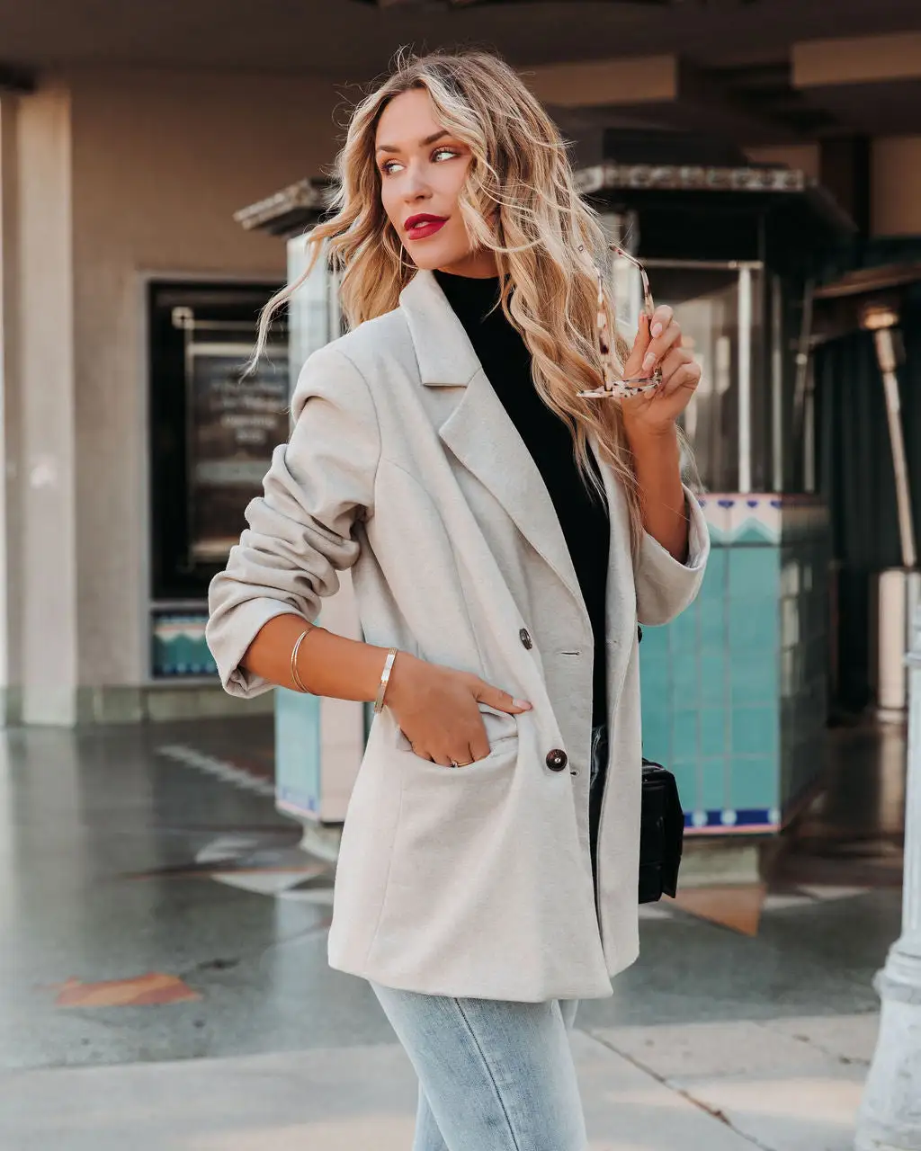 Head into the city to see a show in our Nicolet Pocketed Peacoat! This taupe colored coat features chic shoulder pads. Designed with flap pockets and a notched collar. Secured with front button closures. Styled with the Weston Cream Tortoise Blue Light Glasses, Perfect Hoop Earrings, Simple Bangle Bracelet, Desire Padded Woven Chain Handbag, Averie Sleeveless Turtleneck Knit Top, Mcguire High Rise Distressed Denim, and Jocelyn Heeled Bootie.