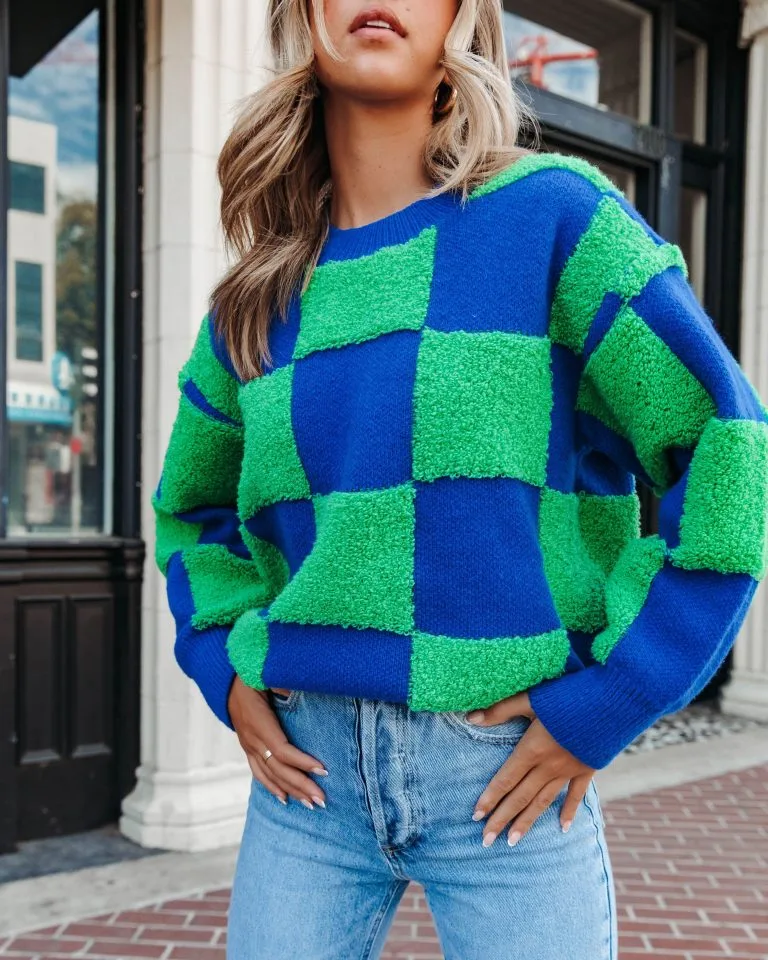 Elevate your sweater collection in the Not Like it Seems Textured Knit Pullover Sweater in green and blue that features a high neckline.