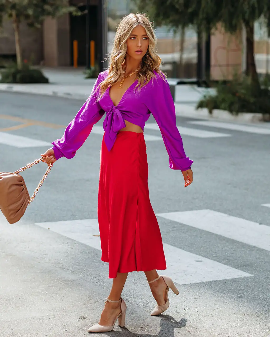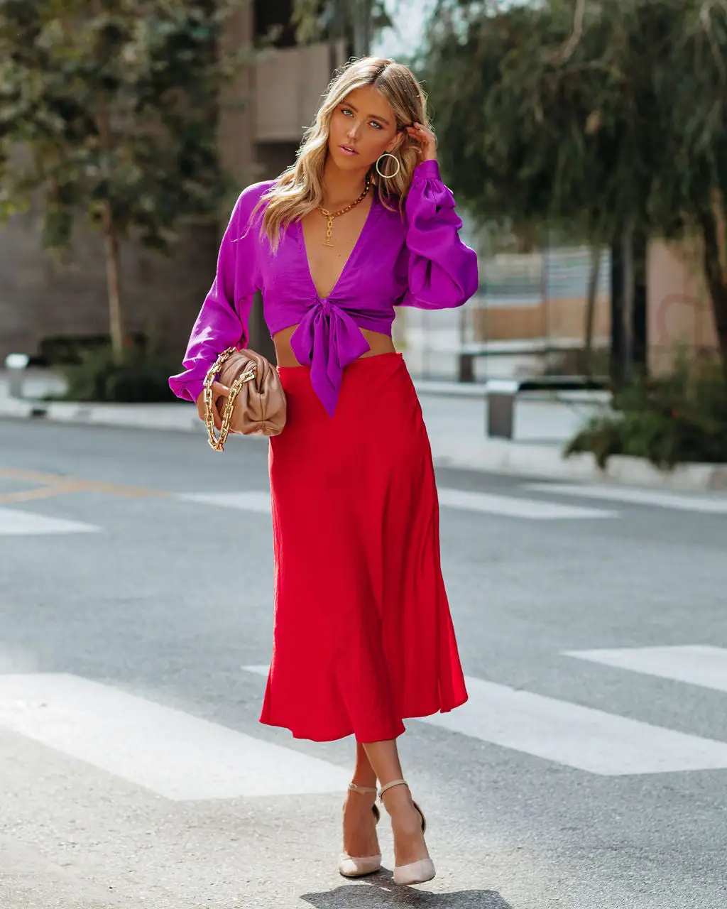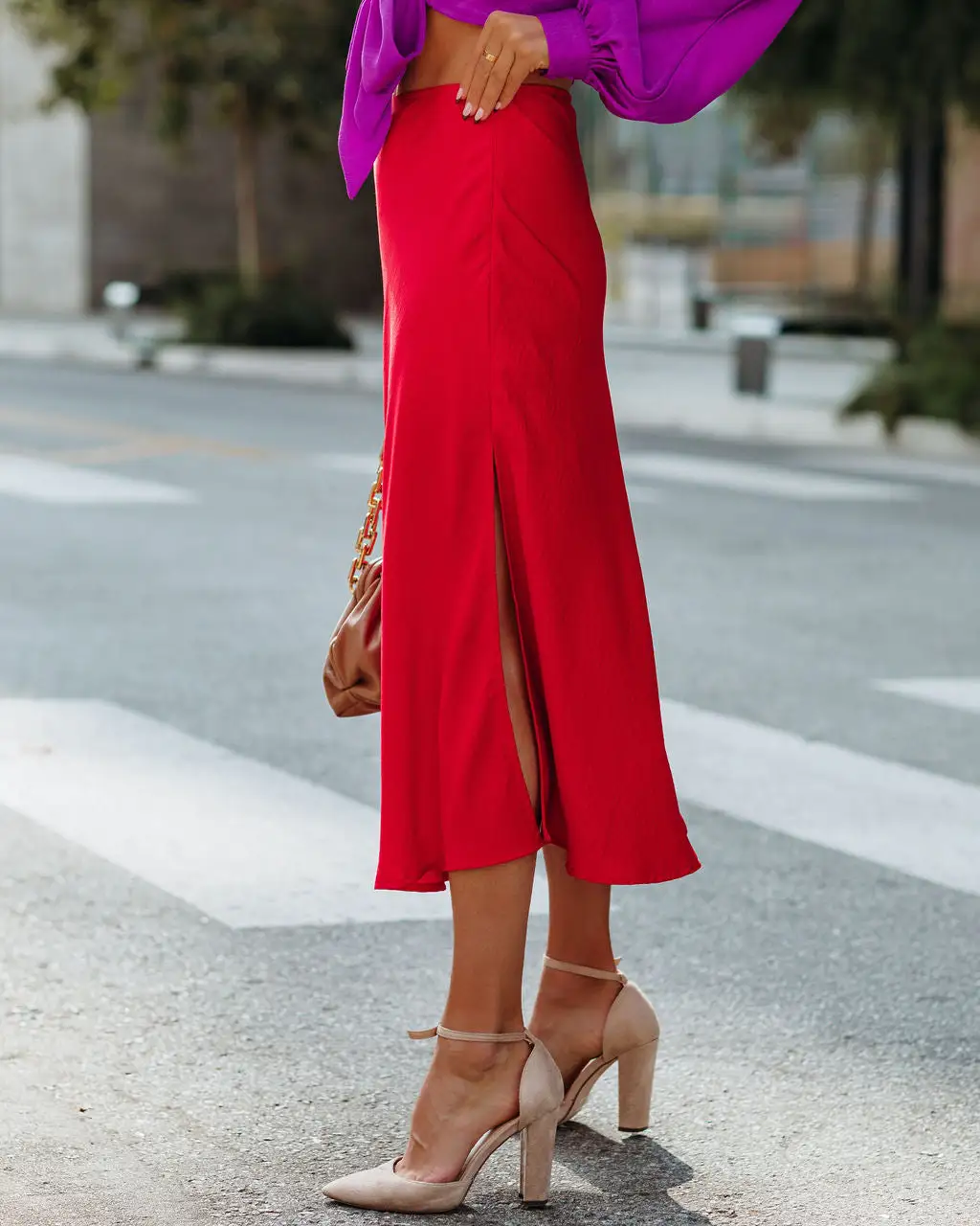//VICI Exclusive// Balance out your satin midi with a chunky knit sweater! Our Wishful Satin Slit Midi Skirt comes in a red hue. Designed with a structured waistband and a side slit. Finished with a concealed side zipper closure. Styled with the Perfect Hoop Earrings, Cameron Toggle Lariat, Chic Crossbody Chain Pouch Bag, Brenda Satin Tie Front Crop Blouse, and Ritz Faux Suede Pointed Heel.