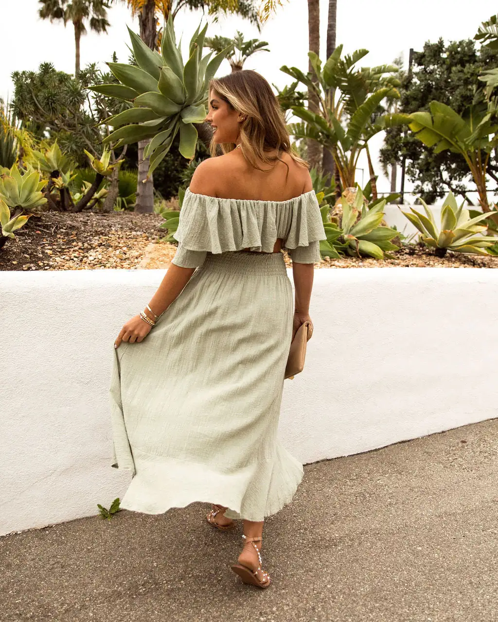 The most whimsical vacay set! Our Huma Cotton Smocked Tassel Maxi Skirt in sage features a sewn tassel tie. Designed with a smocked waistband and front button closures. Styled with the Notion Layered Chain Link Necklace, Simple Bangle Bracelet, Huma Cotton Off The Shoulder Crop Top, Stella Crossbody Envelope Zip Clutch, and Venus Studded Strappy Sandal.