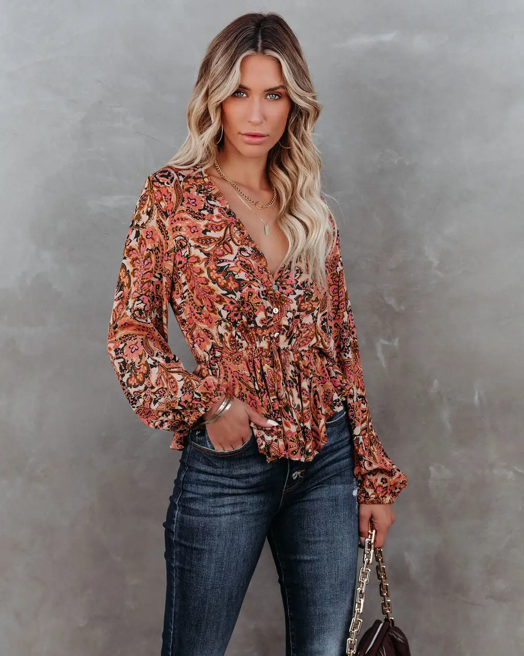 //VICI Exclusive//Best Selling Silhouette//Best Selling Print// Our Unseen Beauty Adjustable Paisley Top delivers autumnal vibes! Rust, pink, black, sand, mocha, and orange hues make up this adjustable top. Finished with a plunging neckline. Styled with the Perfect Hoop Earrings, Bing Layered Chain Necklace, Simple Bangle Bracelet, Chic Crossbody Chain Pouch Bag, Tilley Frayed Ankle High Waisted Skinny, and Ritz Faux Suede Pointed Heel.