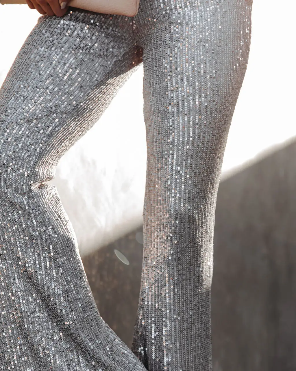 //VICI Exclusive// Go for full out glam in this silver sequin set! Our Festive Flair Sequin High Rise Flare pants feature a high rise. Designed with a structured waistband and a flare pant leg. Styled with the Roxy Hoops, Elena Tennis Necklace, Shayne Gold Link Necklace, Compass Coin Necklace, Simple Bangle Bracelet, Stella Crossbody Envelope Zip Clutch, Charisma Cowl Neck Racerback Tank, Festive Flair Pocketed Sequin Blazer, and Whimsy Heel.
