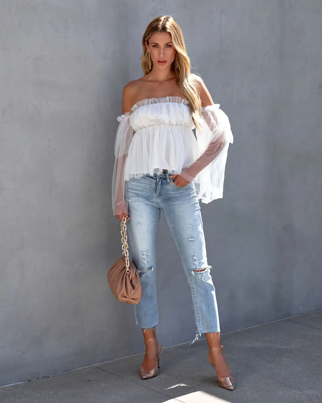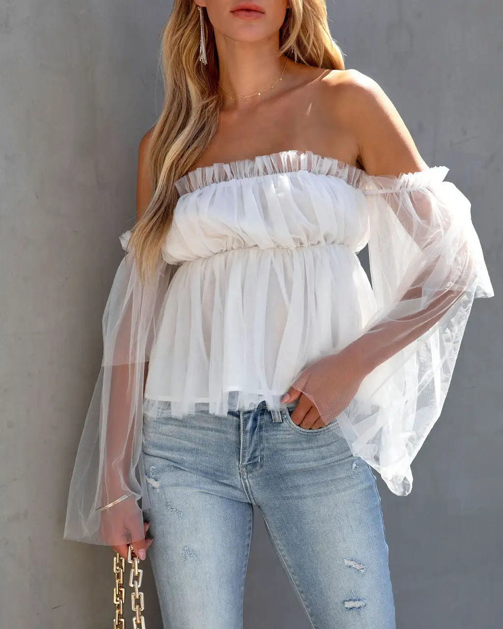Feel like a ballerina in the Renley Off The Shoulder Tulle Blouse in a white hue with frilly, feminine tulle sleeves.