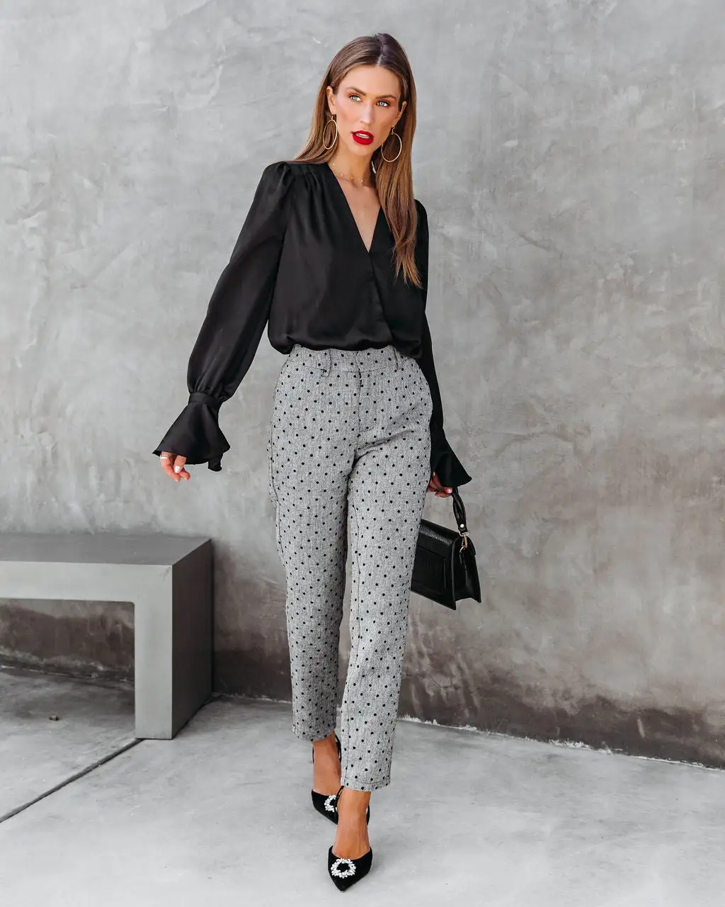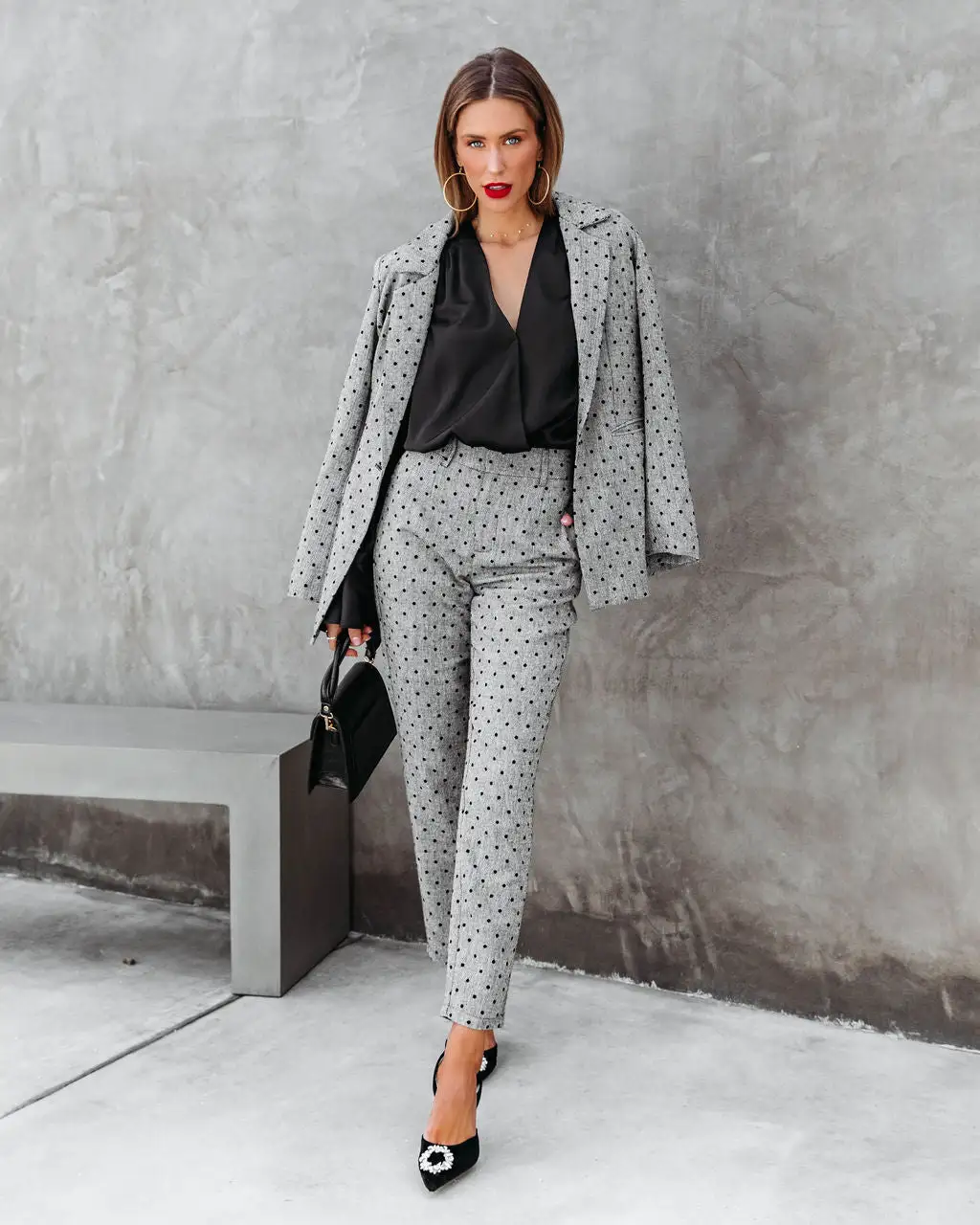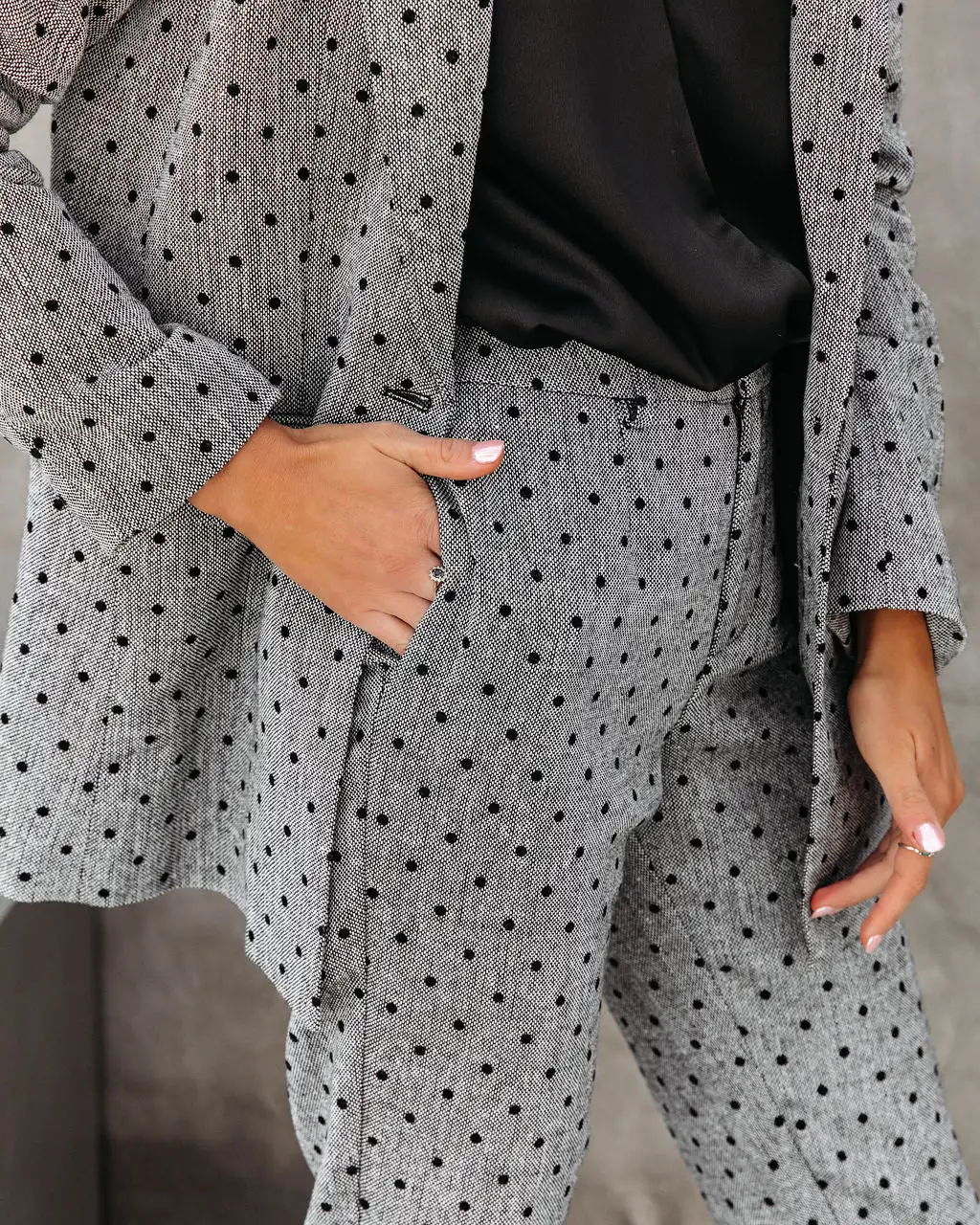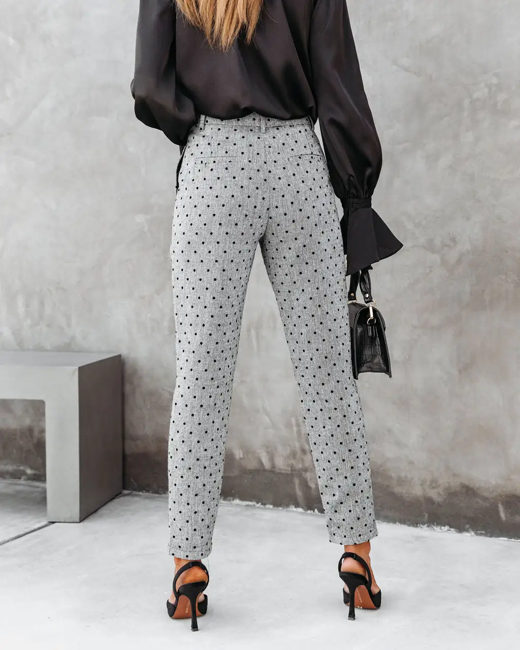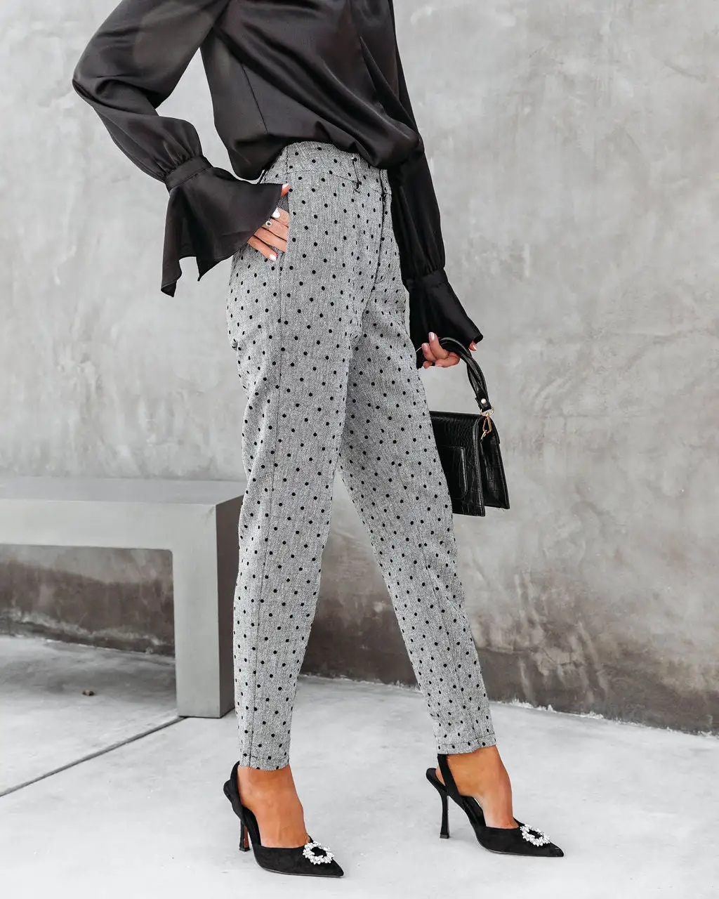 Chic meets festive in the Serving Looks Polka Dot Pocketed Pants in grey that feature a straight leg.