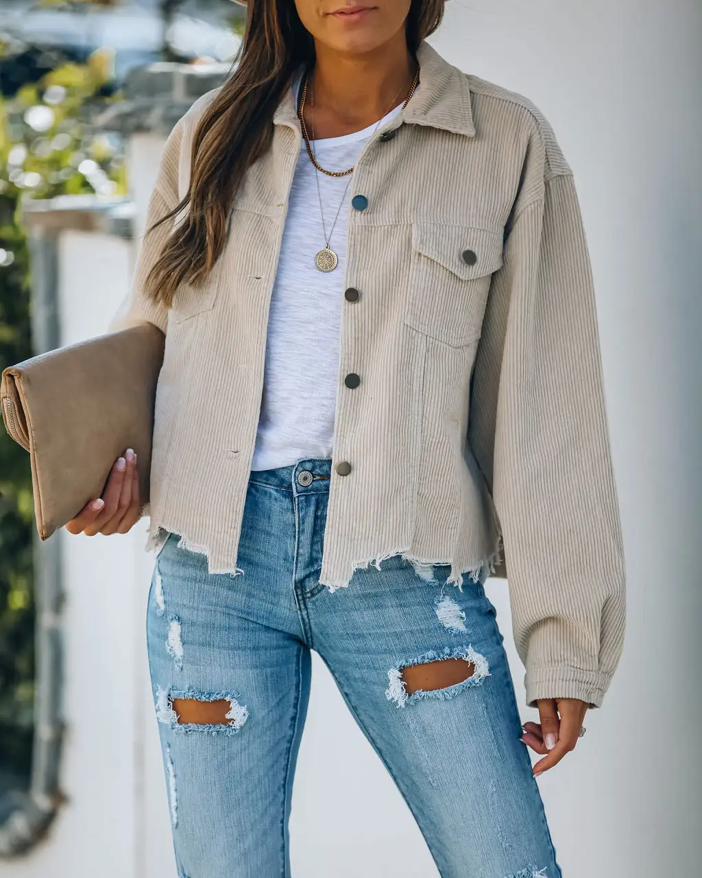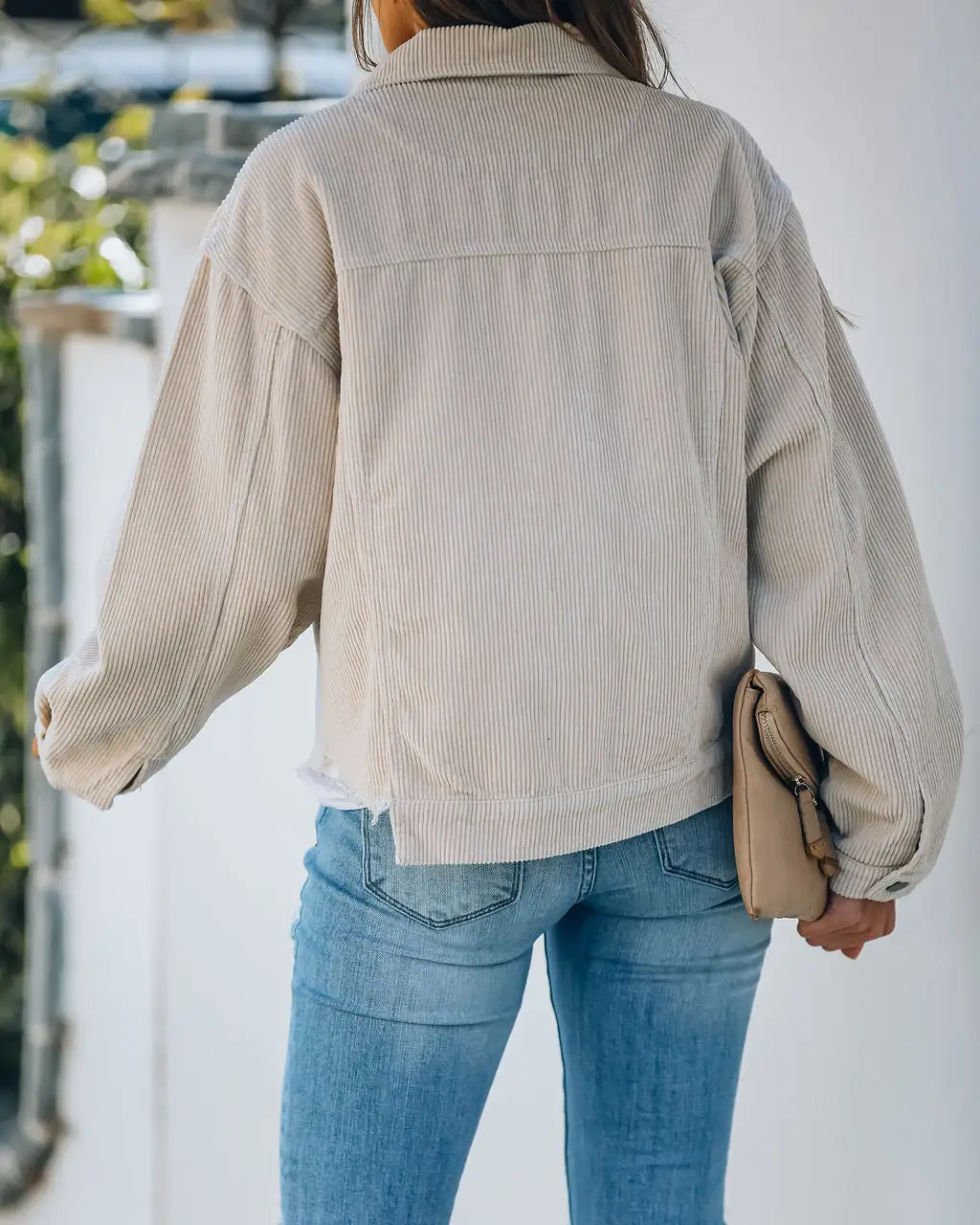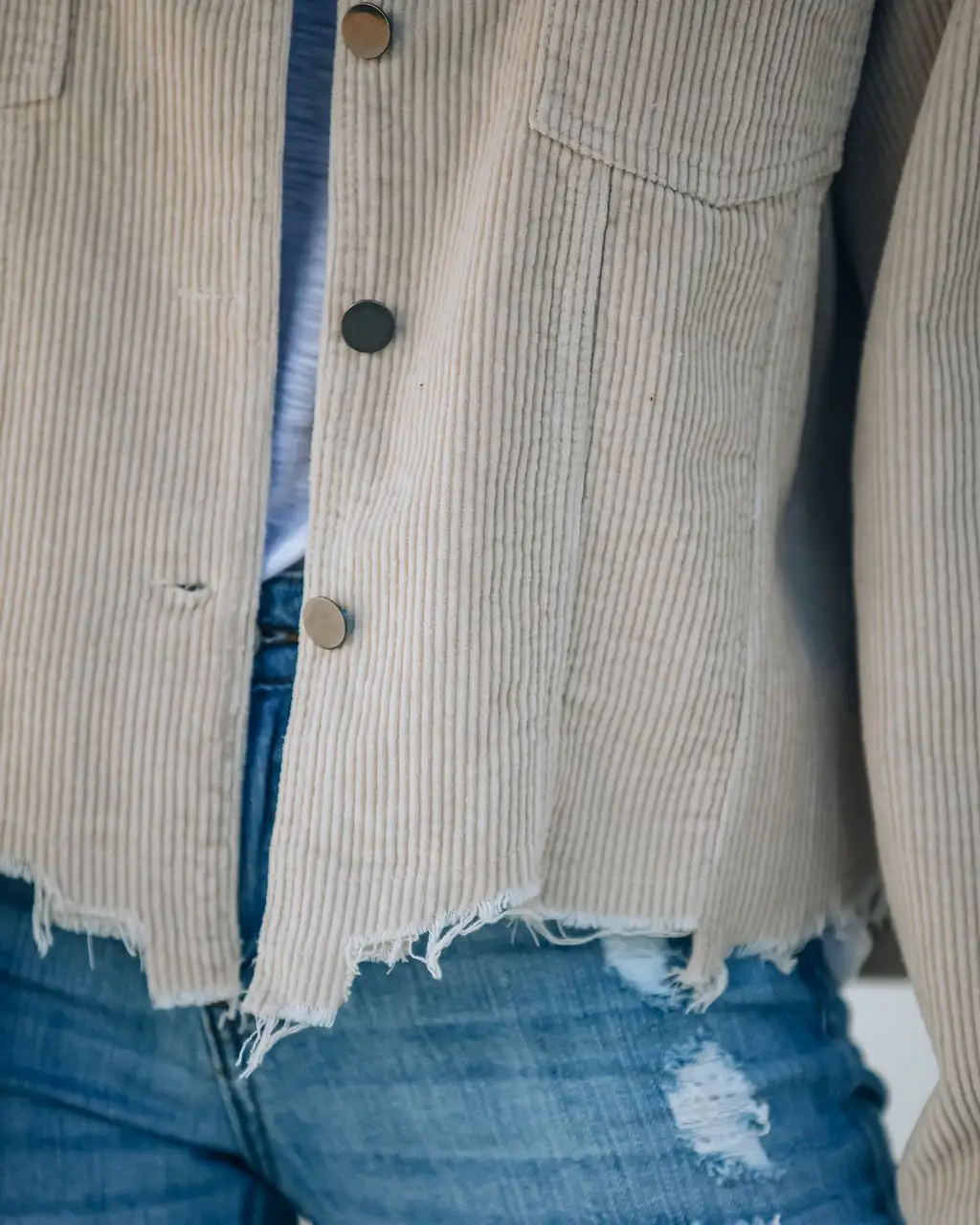 //VICI Exclusive//Best Seller// We could not love the corduroy trend more! Our Paddington Distressed Cotton Corduroy Jacket in beige wash is a classic piece that will give you adorable styling options for years to come! We adore the ribbed corduroy texture, the frayed hemline, and the button detailing along the neckline and pockets! Styled with the El Dorado Hat, Niles Curb Chain, The Buddha Wheel Necklace, Kelsey Chain Bracelet, Stella Crossbody Envelope Zip Clutch, Malibu Crewneck Tee, Universal Mid Rise Distressed Skinny, and Uptown Faux Suede Heeled Boot.