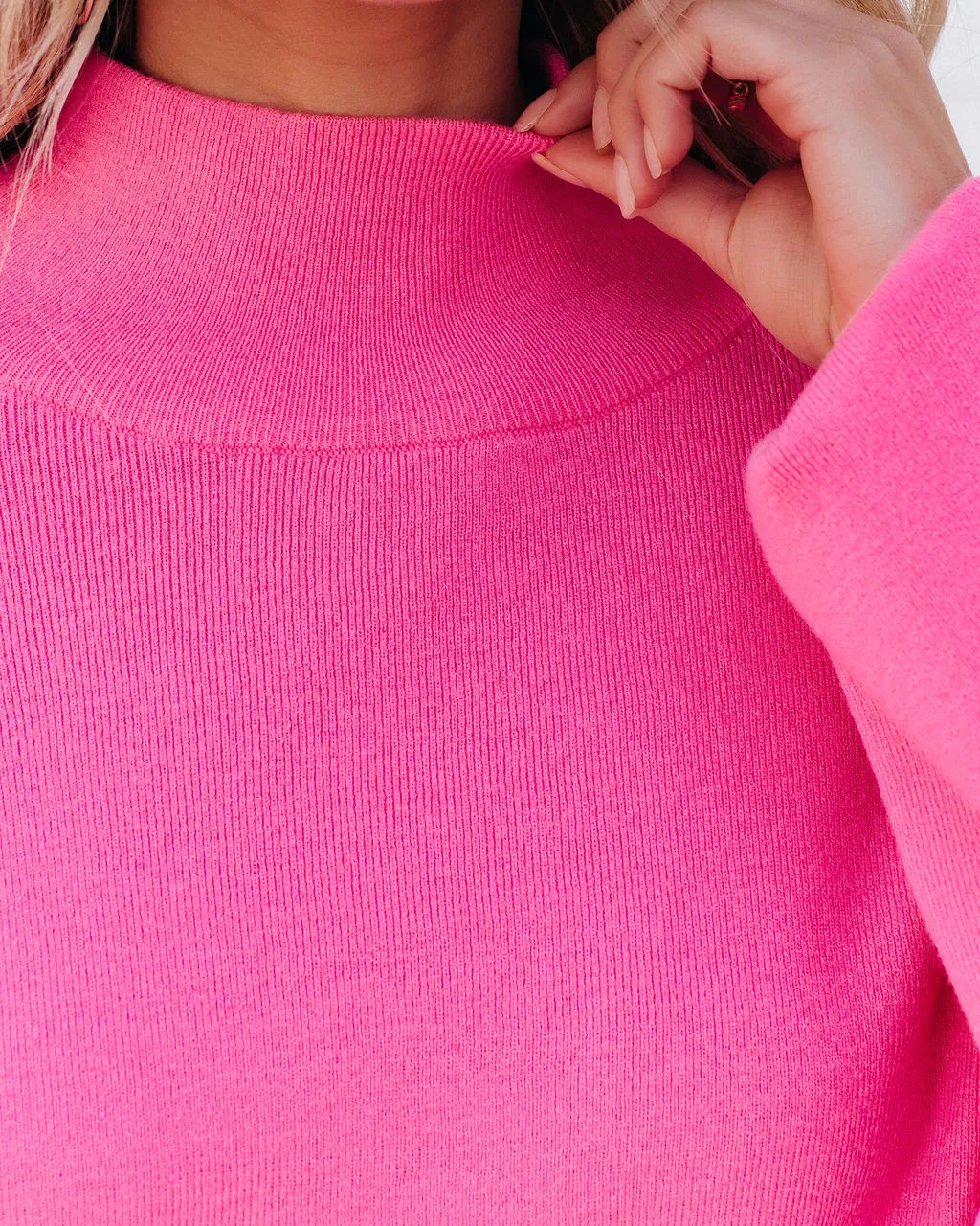 //VICI Exclusive// Best Seller// New Color// Our Parkin Mock Neck Knit Sweater is ready for the mountains! This pink colored knit sweater features a mock neckline and ribbed edges. Perfect to pair with dark wash denim! Styled with the Perfect Hoop Earrings, Simple Bangle Bracelet, Stella Crossbody Envelope Zip Clutch, Henderson High Rise Distressed Denim, and Maylene Braided Square Toe Heeled Sandal.