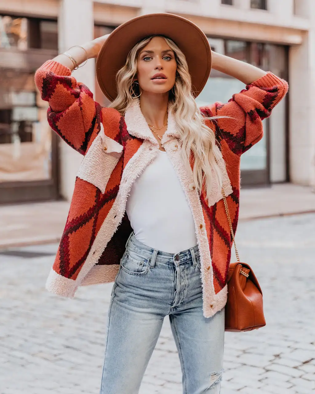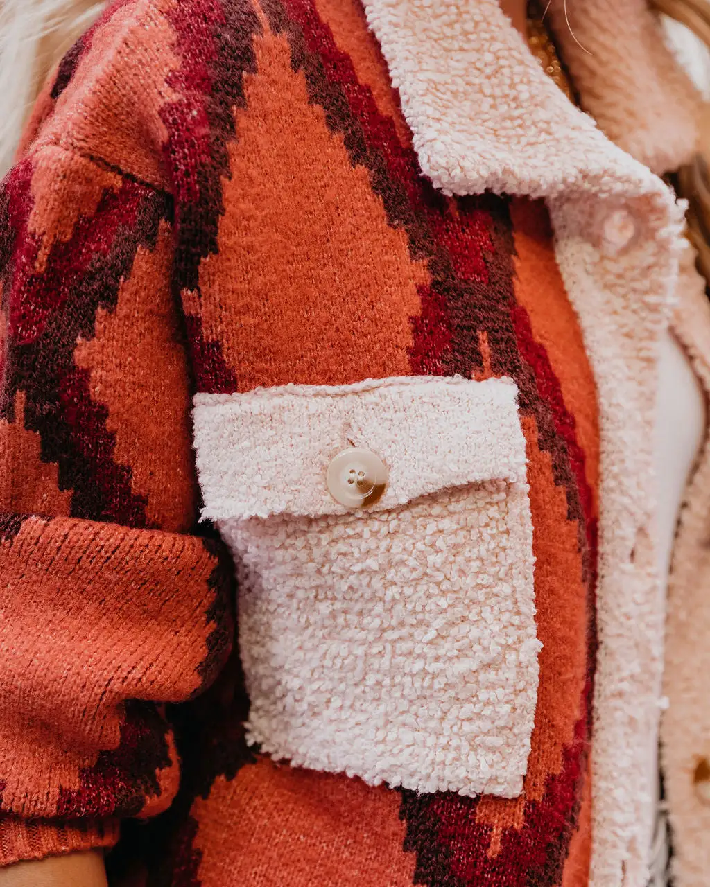 Our Parkside Patterned Knit Jacket was made in the coziest thick knit! This rust, burgundy, chocolate, and blush piece is detailed with a collar. Designed with bust pockets and front button closures. Styled with the El Dorado Hat, Perfect Hoop Earrings, Chloe Mini Necklace, Mosaic Coin Necklace, Sia Toggle Pendant Necklace, Simple Bangle Bracelet, On The Fly Crossbody Bag, Calm Seamless Scoop Cami, Kason Distressed High Rise Denim, and Tribeca Faux Leather Heeled Bootie.