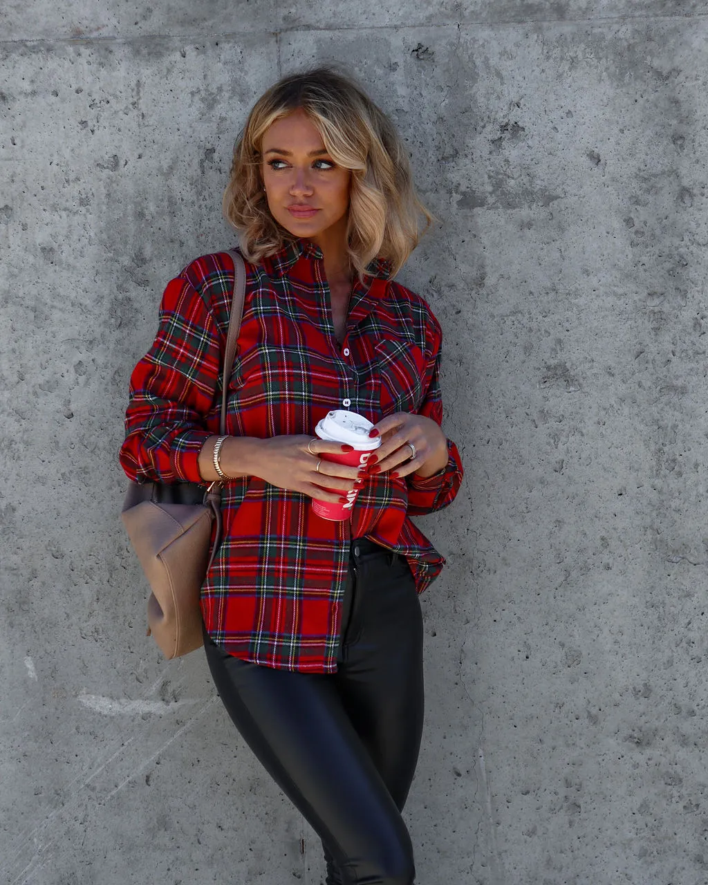 Cool girls will love the Peppermint Mocha Mood Plaid Button Down Top in red that features a collar.