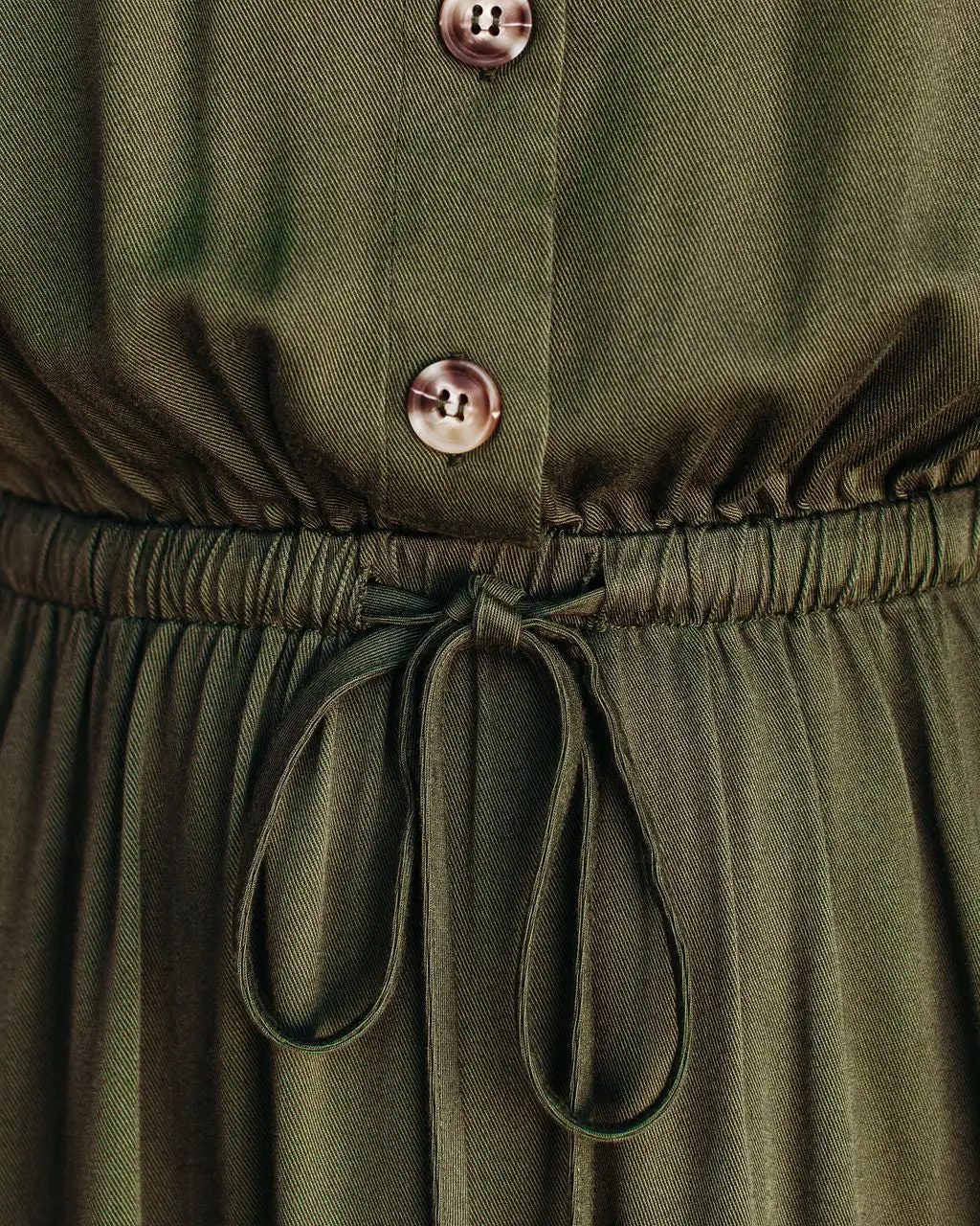 Our Perth Cotton Pocketed Button Down Utility Dress comes in a gorgeous olive hue! This cotton dress features a utility style with a collar and sewn cuffed short sleeves. The elastic drawstring waist and side pockets provide convenience. Styled with the Michaela Hoops, Initial Card Necklace, Mica Chain Choker Necklace, Lou Tag Necklace, Highland Bag, and Brycen Faux Leather Lace Up Boot.