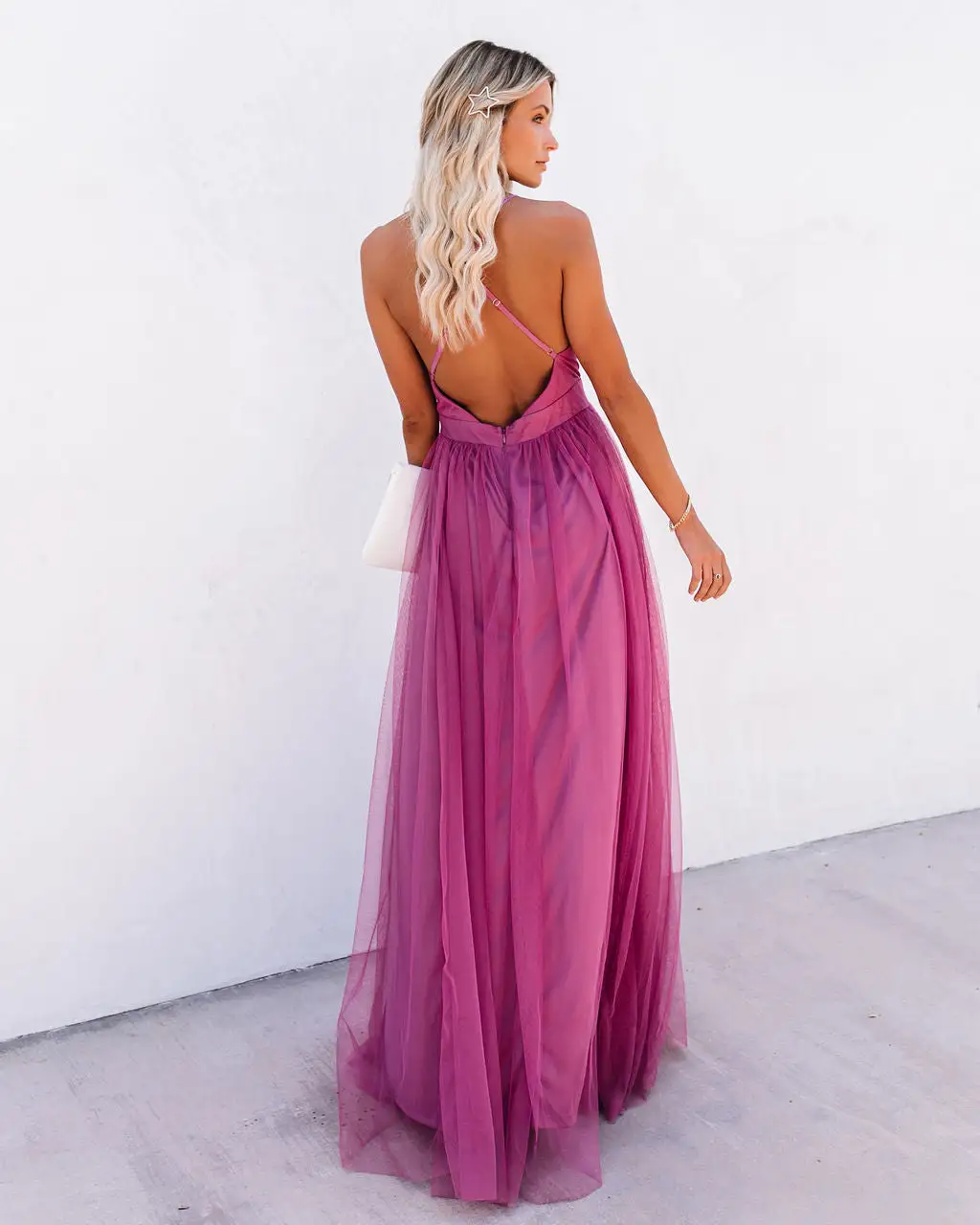 //Best Seller//New Color// Our Petal Dust Maxi Dress in magenta pink is gracefully epic! Designed with a plunging v-neckline with adjustable spaghetti straps, criss crossing a backless silhouette. Fitting with a full bodied, tulle fabric skirt with an underlay. We’re calling this a whimsical dream! The bust pleating ties it together to create the full effect. A great piece to style for the Summer with dainty jewelry and heeled sandals! Finished with a concealed back zipper. Styled with the Proxima Star Hair Clip, Perfect Hoop Earrings, Time Will Tell Layered Necklace, Kelsey Chain Bracelet, Larkin Heel and the Stella Crossbody Envelope Zip Clutch.