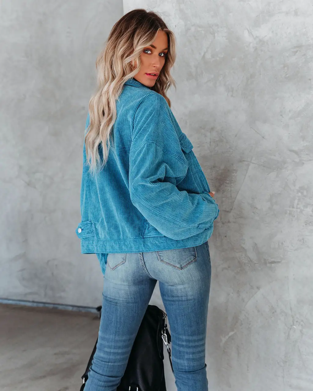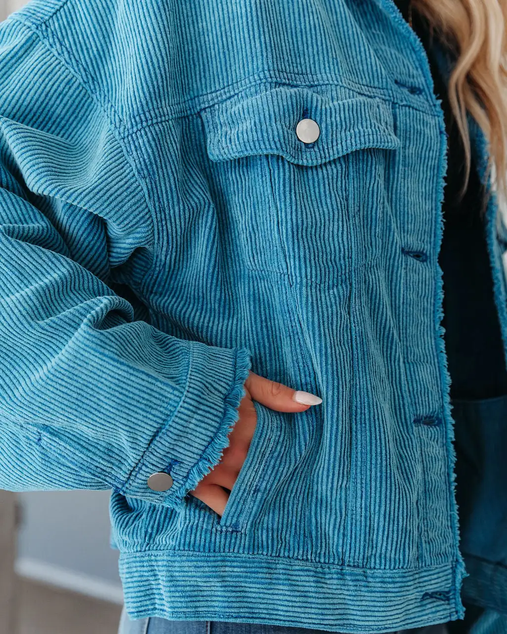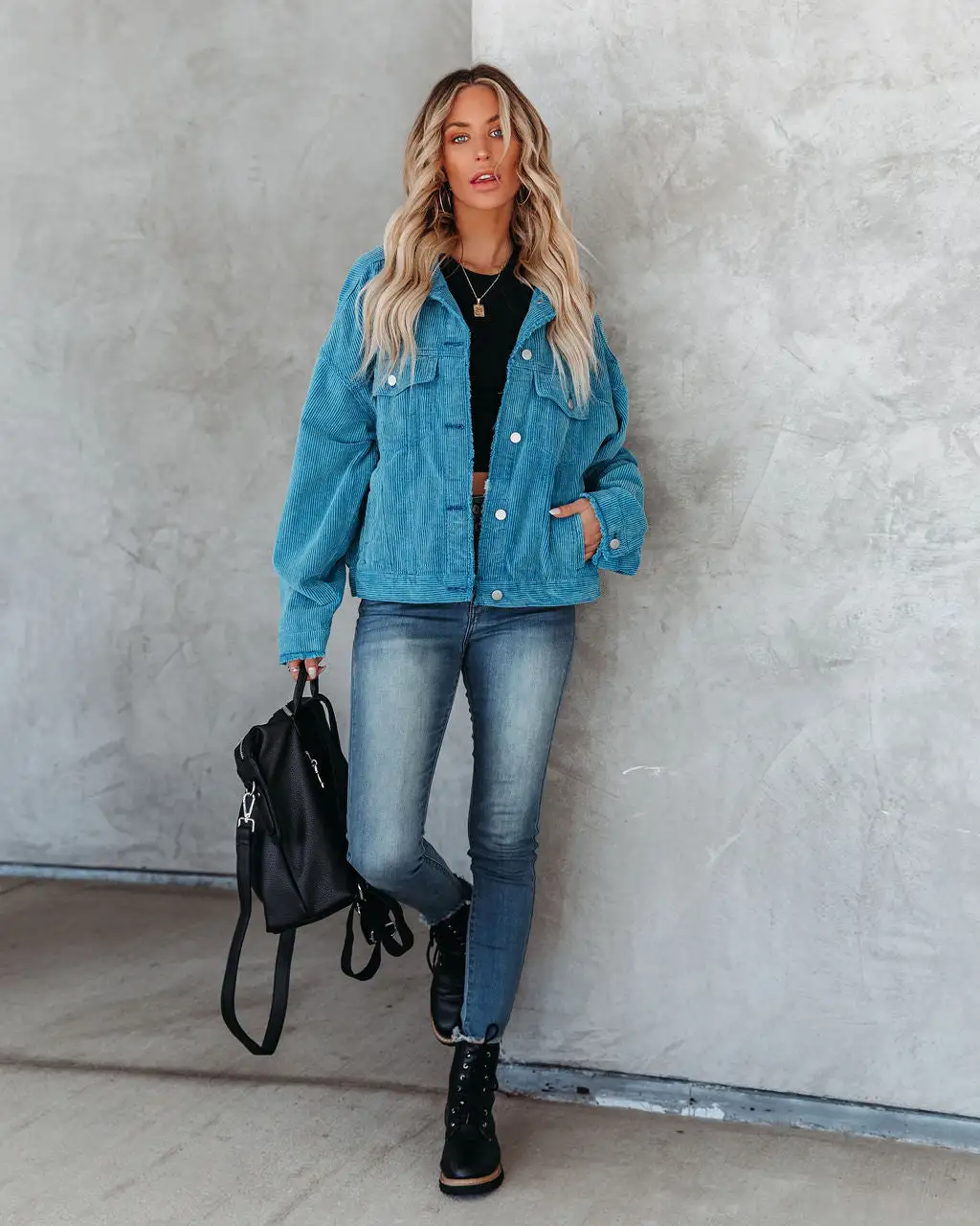 We could not love the corduroy trend more! Our Condola Cotton Pocketed Corduroy Jacket in blue is a fun statement maker! We adore the ribbed corduroy texture and frayed edges. Finished with side and bust pockets. Styled with the Perfect Hoop Earrings, Chloe Mini Necklace, Initial Card Necklace, Ciara Seamless Crop Top, Only The Best High Rise Button Front Skinny, Brycen Faux Leather Lace Up Boot, and Kenzie Backpack.