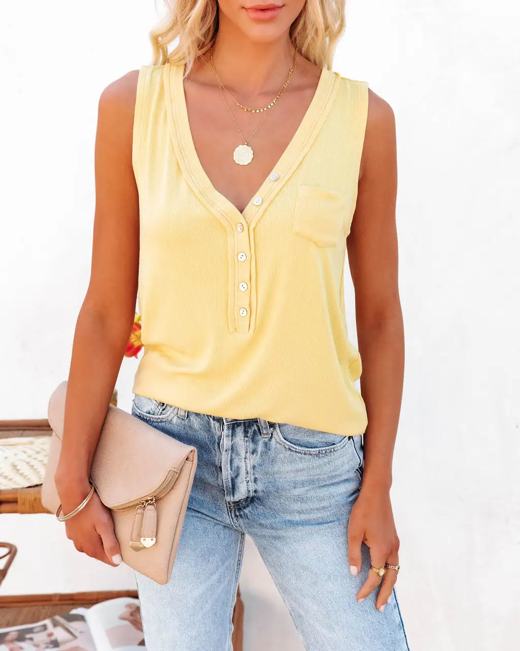 Cool and casual, the Rylah Knit Henley Tank in yellow features a bust pocket and a scooped neckline.