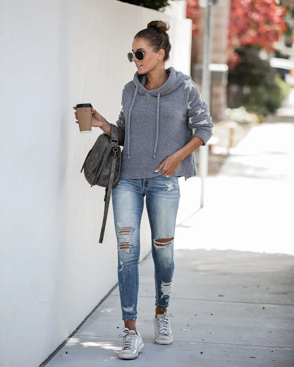 Cozy, soft + warm. Our Polaris Soft Knit Star Hoodie needs no further introduction! This grey hoodie features white raw knit stars that detail the long sleeves. Style this soft and stretchy hoodie with denim and sneakers for a casual and leisure vibe! Finished with a drawstring closure. Styled with the Chloe Mini Necklace, Carly Distressed Skinny, All-Star Faux Suede Metallic Sneakers and the Highland Bag.
