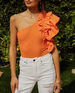 SALT-001 Statement Maker Ribbed One Shoulder Ruffle Bodysuit – Orange – SALE