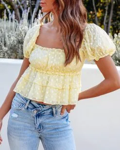 OLIA-001 Shelby Eyelet Puff Sleeve Peplum Top – Lemon – SALE