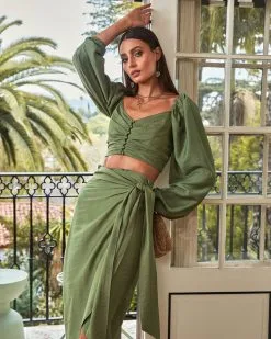 Got It Good Puff Sleeve Ruched Crop Top – Olive – SALE