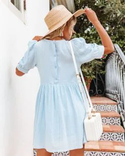 Amber Cotton Pocketed Puff Sleeve Dress – Light Blue – FINAL SALE