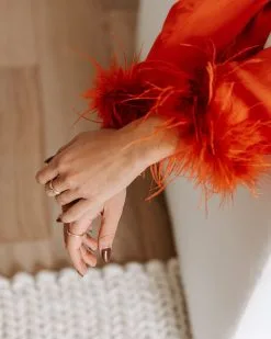 ON T-001 Marilynn Satin Feather Trim Button Down Top – Burnt Orange – FINAL SALE