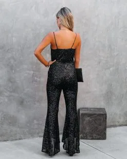 Zaida High Low Flare Sequin Jumpsuit – Black – LAST CHANCE