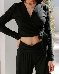 Take A Breather Ribbed Long Sleeve Wrap Top – Black – FINAL SALE