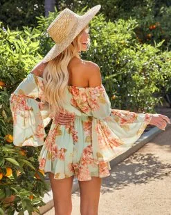 Judas Floral Off The Shoulder Bell Sleeve Romper – Sage – FINAL SALE