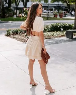 Raydon Linen Blend Pocketed Tie Front Romper – Beige – FINAL SALE