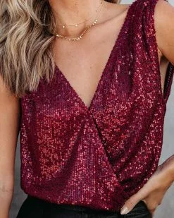 OLIA-001 Glitz And Glam Drape Sequin Bodysuit – Burgundy – FINAL SALE