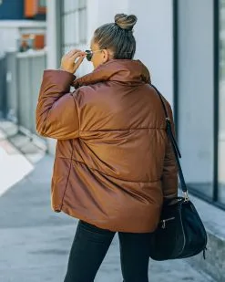 Cade Pocketed Faux Leather Puffer Jacket – Brown – SALE
