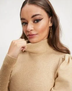 DEE-001 Center Of Attention Ribbed Turtleneck Puff Sleeve Bodysuit – Beige – FINAL SALE