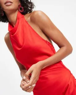 Havyn Satin Asymmetrical Halter Midi Dress – Red – SALE