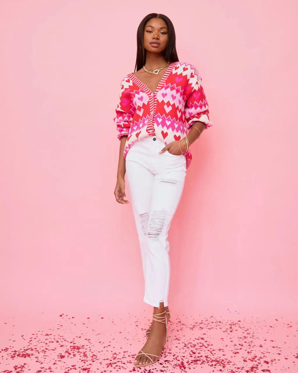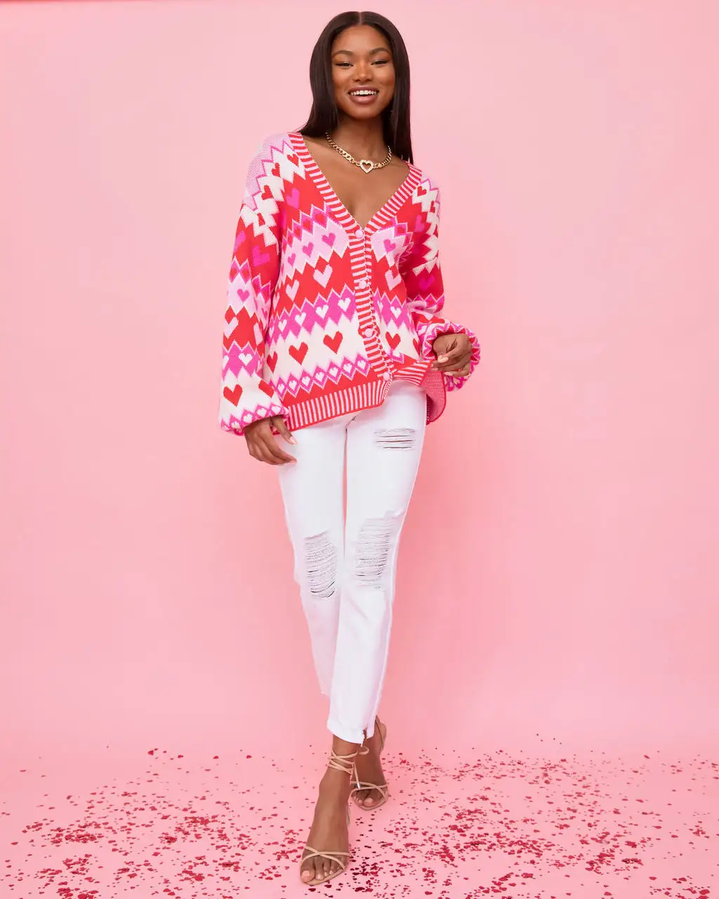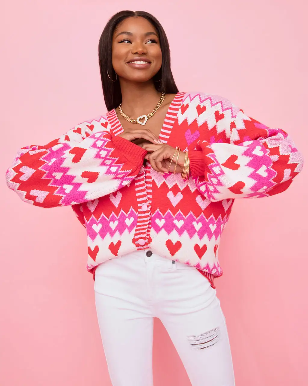 Cue up compliments in the Queen Of Hearts Cardigan in red and pink that features a relaxed fit.