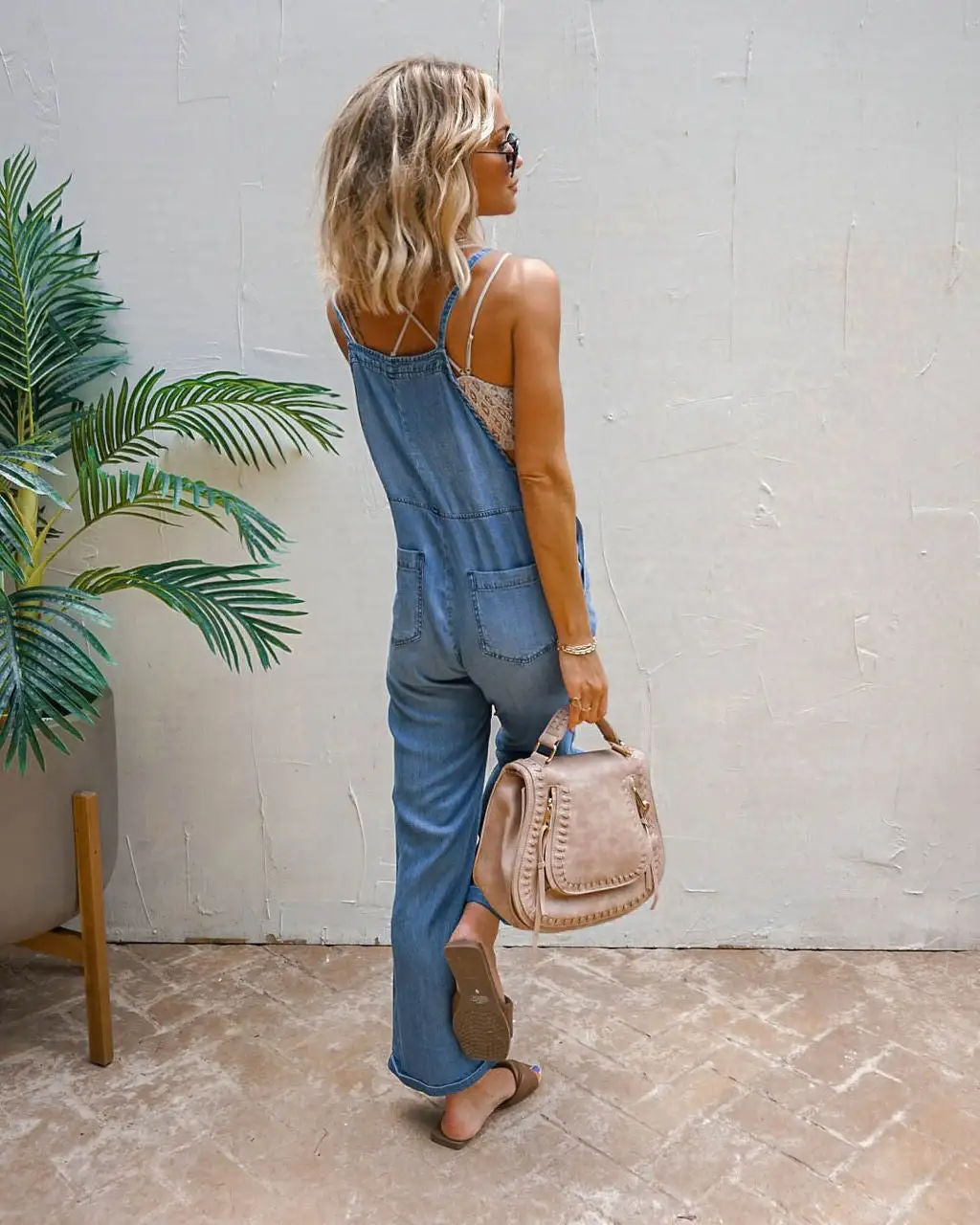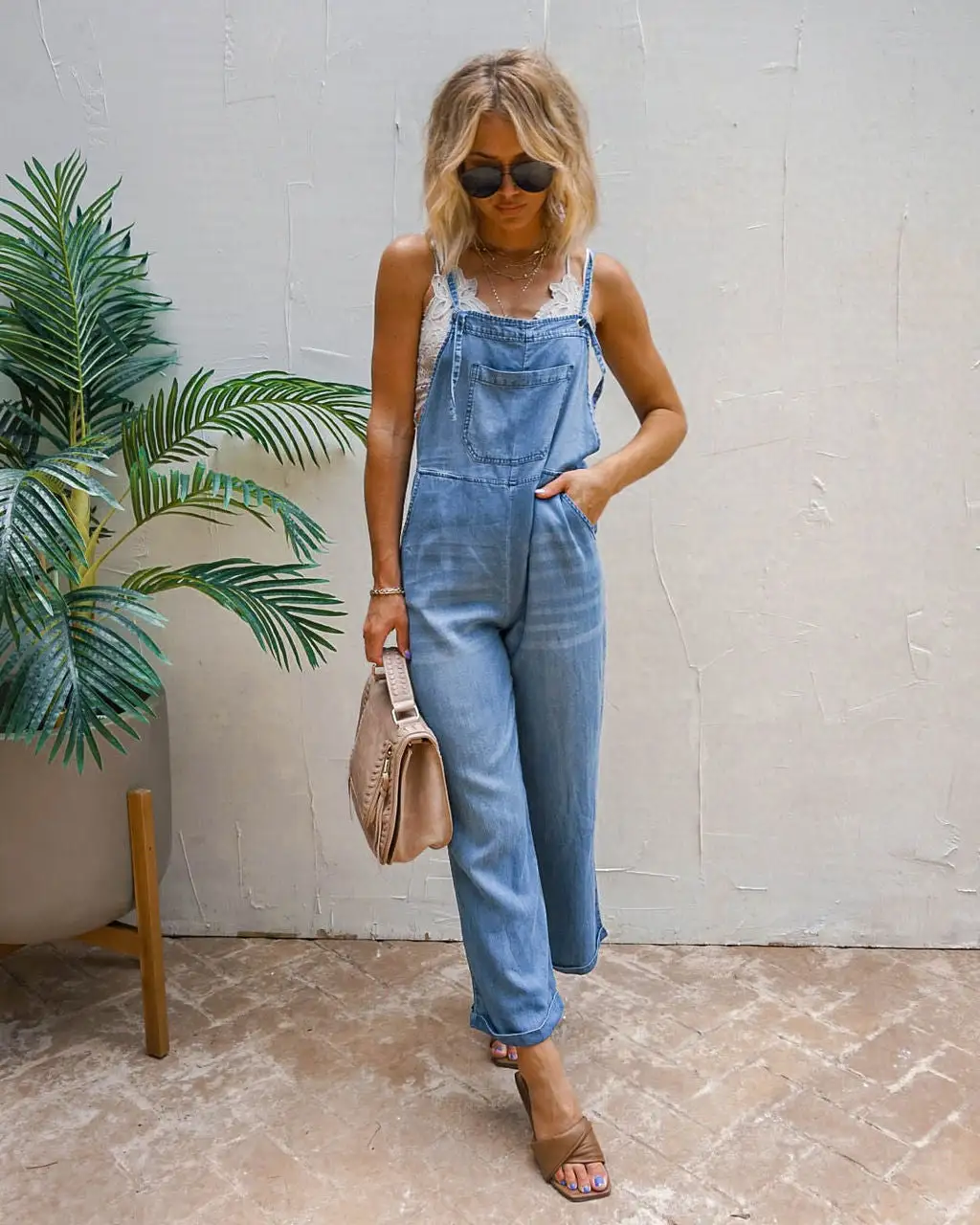 Fashion girls will love the Quinto Cotton Chambray Jumpsuit in medium wash that features a bib pocket.