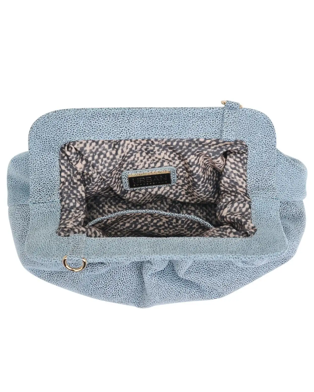 Hold all of your essentials in our Remy Crossbody Pouch Bag! This ice blue textured faux leather pouch has a removable gold chain crossbody strap. A magnet closure finished this bag. Styled with the Simple Bangle Bracelets and Definitely Demure Off The Shoulder Chiffon Romper.