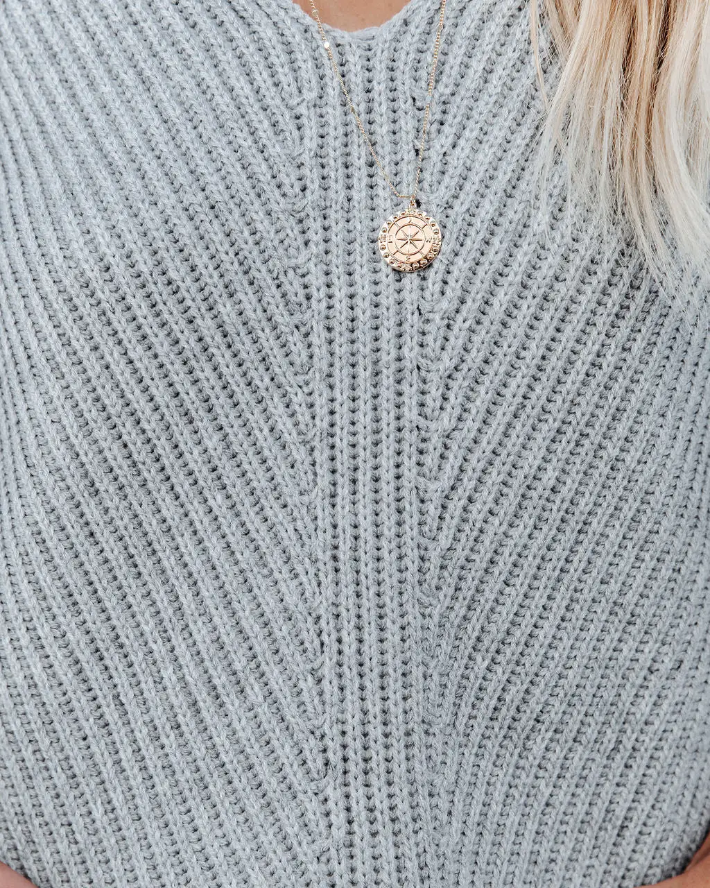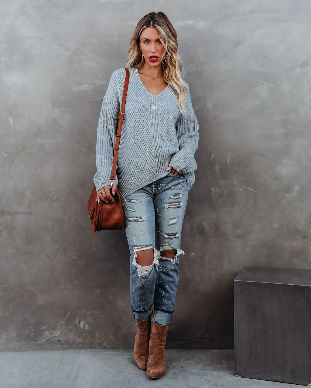 //VICI Exclusive// Our Repeat After Me Knit Sweater is a cold weather classic! This heather grey colored sweater is perfectly slouchy. Crafted with a rounded v-neckline and a ribbed fabrication. Tuck this oversized piece into distressed denim. Styled with the Perfect Hoop Earrings, Highland Bag, Hard Work Distressed Girlfriend Splatter Denim, and Colby Faux Suede Heeled Bootie.