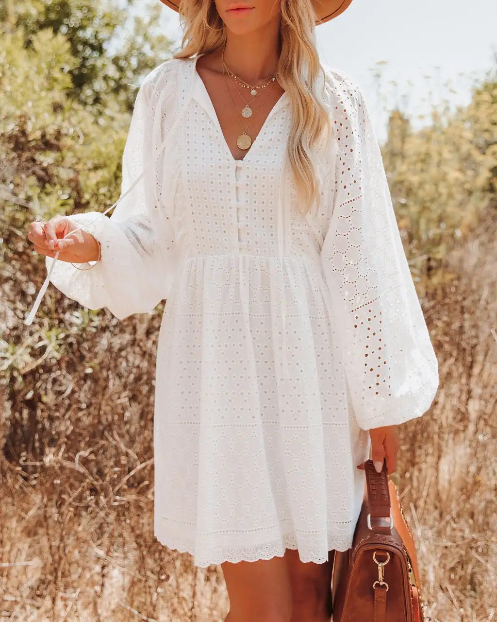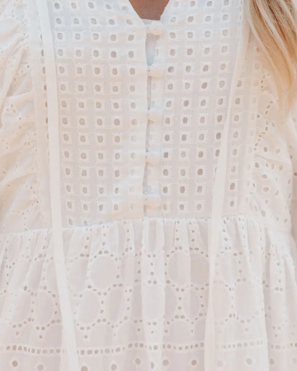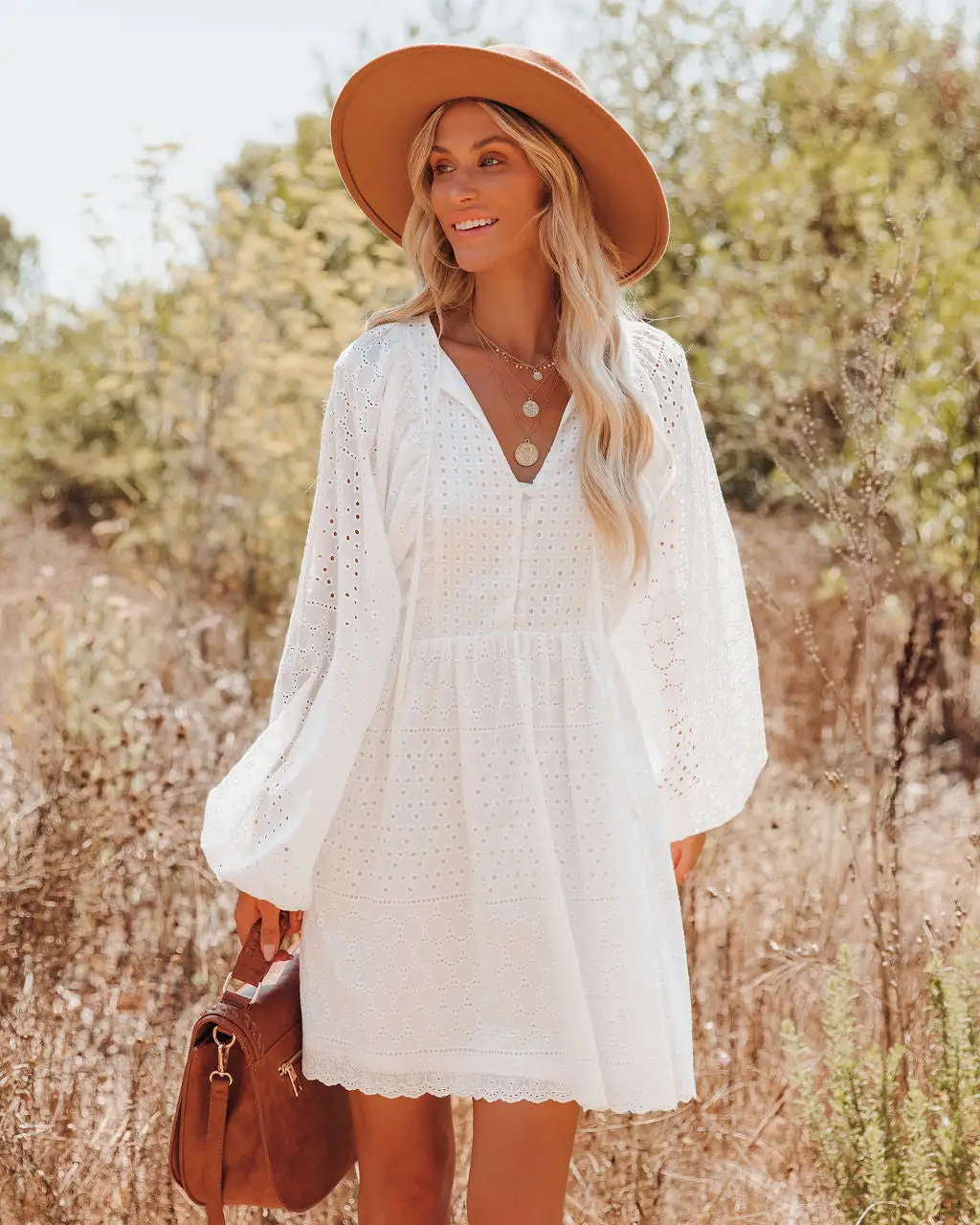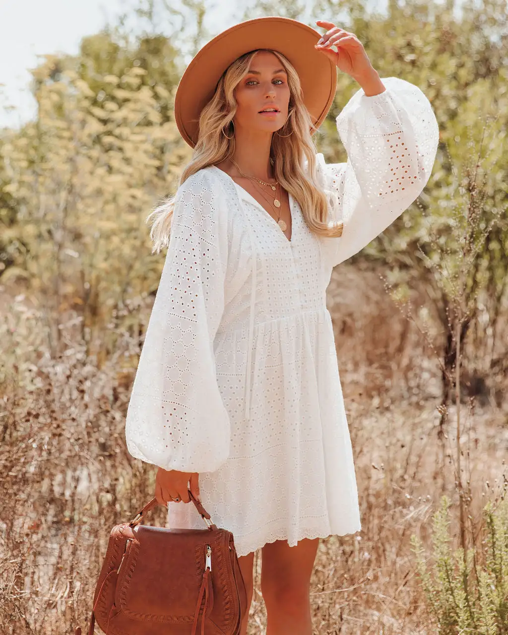 //VICI Exclusive// Our Rising Wind Cotton Eyelet Dress is so sweet for summer days! This white cotton eyelet mini is detailed with front buttons. Pair this long sleeved dress with tan sandals. Styled with the El Dorado Hat, Perfect Hoops, Chloe Mini Necklace, Truth Be Told Layered Pendant Necklace, Simple Bangle Bracelet, Highland Bag, and Uptown Faux Suede Heeled Bootie.