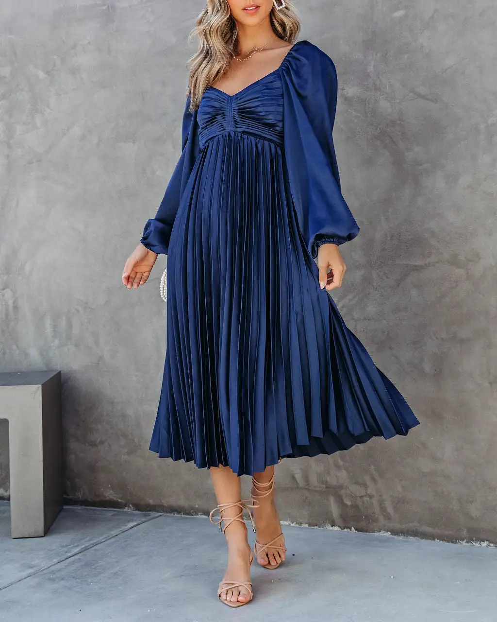 Look like a gem in the Romantic One Satin Pleated Midi Dress in navy that features a midi length.