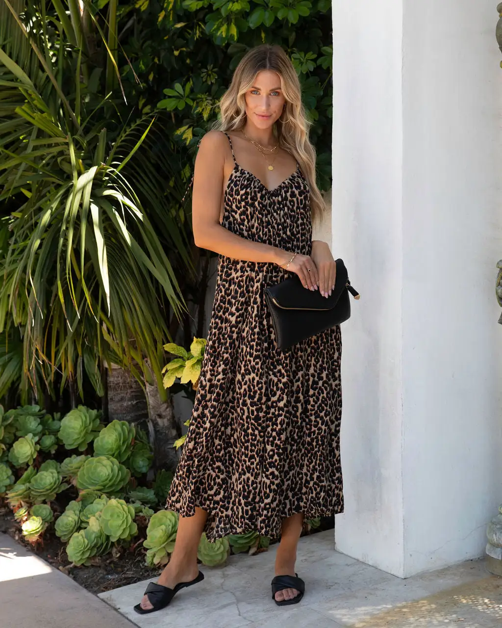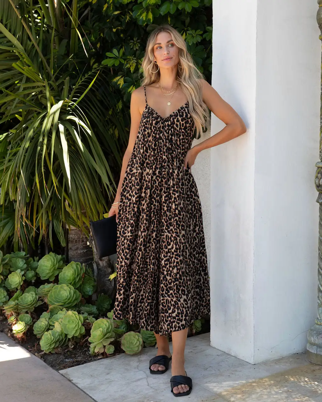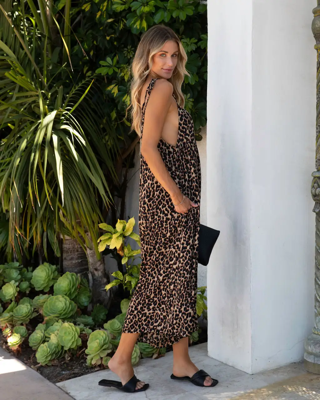 Wander around town in the Running Wild Pocketed Leopard Jumpsuit in brown and black that features side pockets.