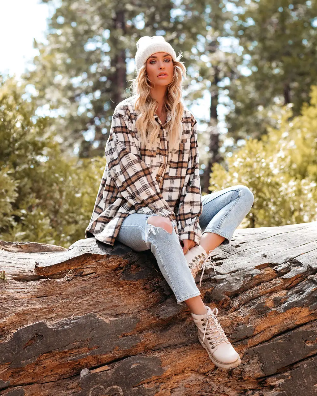 Head to a cabin our Rydell Plaid Button Down Shacket! This cream, beige, and chocolate brown hued shacket features bust pockets. Designed with front button closures and button cuffs. Styled with the Chilly Ribbed Beanie, Chloe Mini Necklace, The Buddha Wheel Necklace, Allie Tassel Bucket Bag, Physique Racerback Tank, Kason Distressed High Rise Denim, and Kinsley Faux Leather Lace Up Boot.