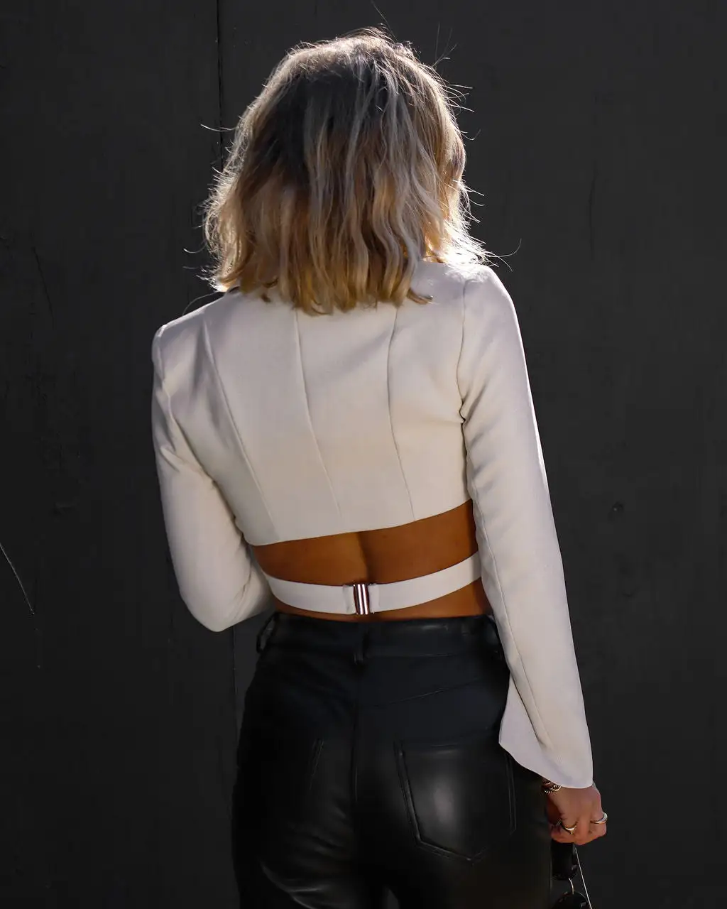 Chic meets spicy in the Sabine Cropped Wrap Blazer in taupe that features padded shoulders.