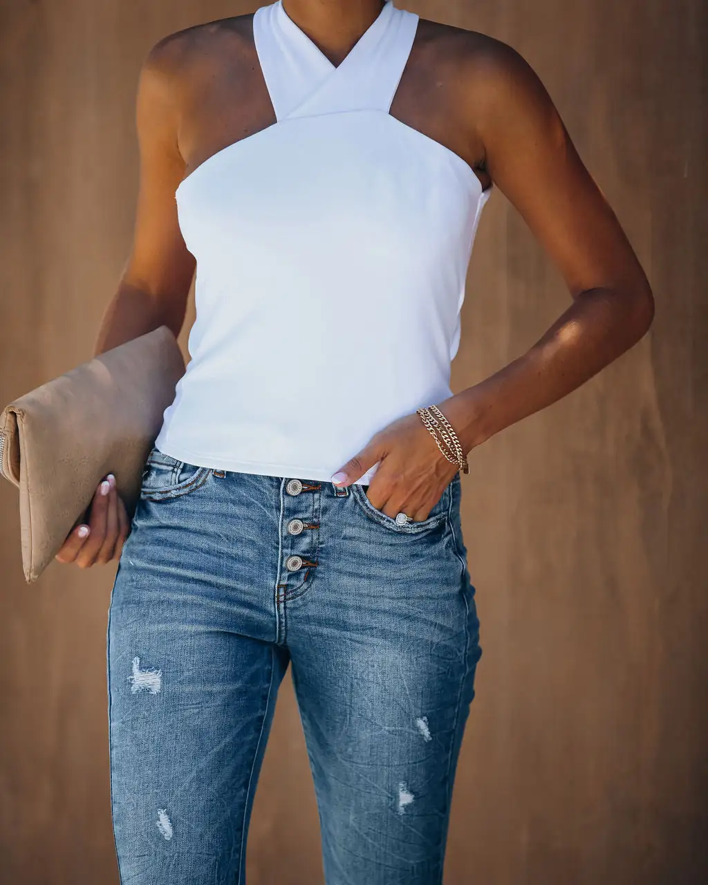 //Best Seller// This top is the one! Our Cross Paths Knit Tie Tank is a sassy upgrade to your Summer wardrobe. This stretchy white top fits snugly throughout with a criss cross neckline and open back. A back waist tie holds the look together with alluring appeal! Styled with the Kelsey Chain Bracelet, Suri High Rise Distressed Skinnies, Larkin Heel and the Stella Crossbody Envelope Zip Clutch.