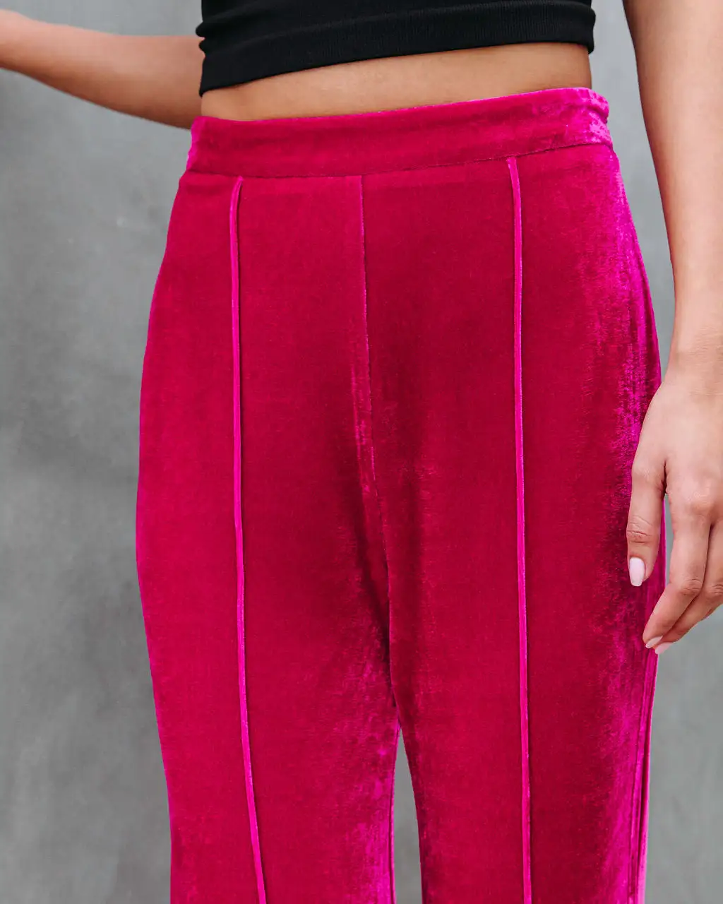 Fun pants for the win! Our Amani High Rise Velvet Flare Pants come in a holiday ready fuchsia hue. Designed with a retro flare pant leg. Secured with a concealed side zipper closure.