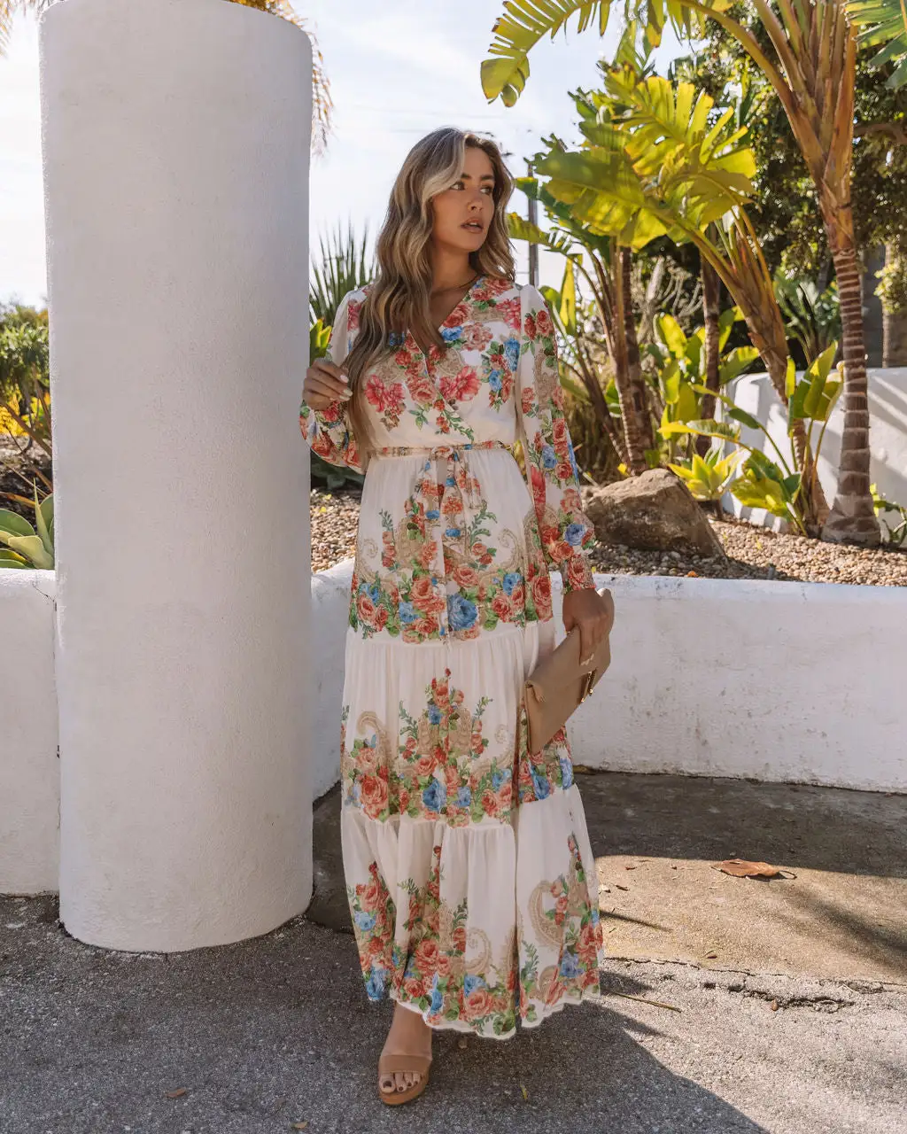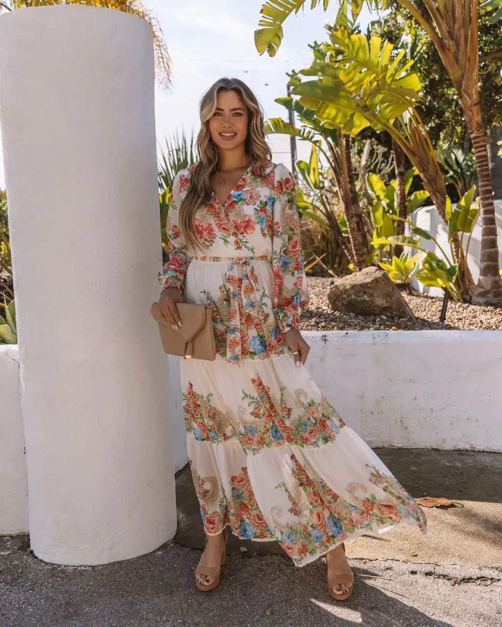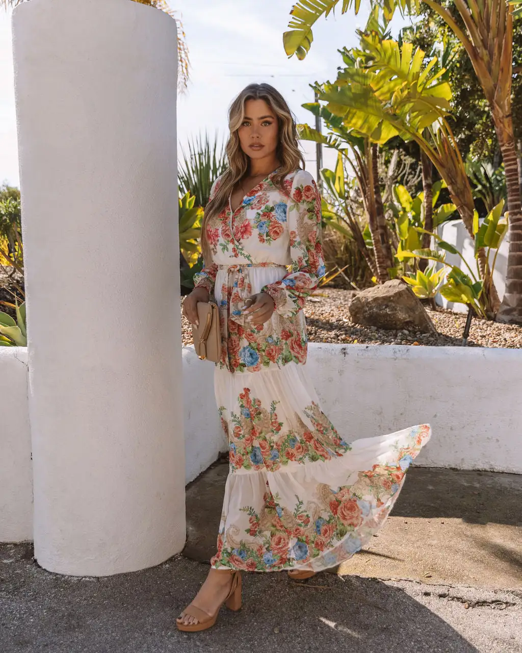 Our Joliet Floral Tiered Maxi Dress is so ethereal! Ivory, olive, blue, rust, pink, and taupe florals detail this maxi. Designed with an adjustable waist tie closure and a draped neckline. Styled with the Minimal Herringbone Necklace, Simple Bangle Bracelet, Stella Crossbody Envelope Zip Clutch, and Go On Faux Leather Heeled Platform Sandal.