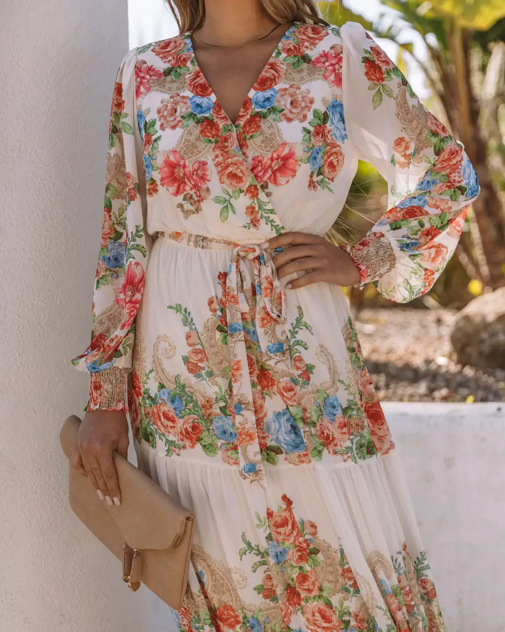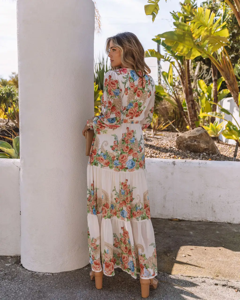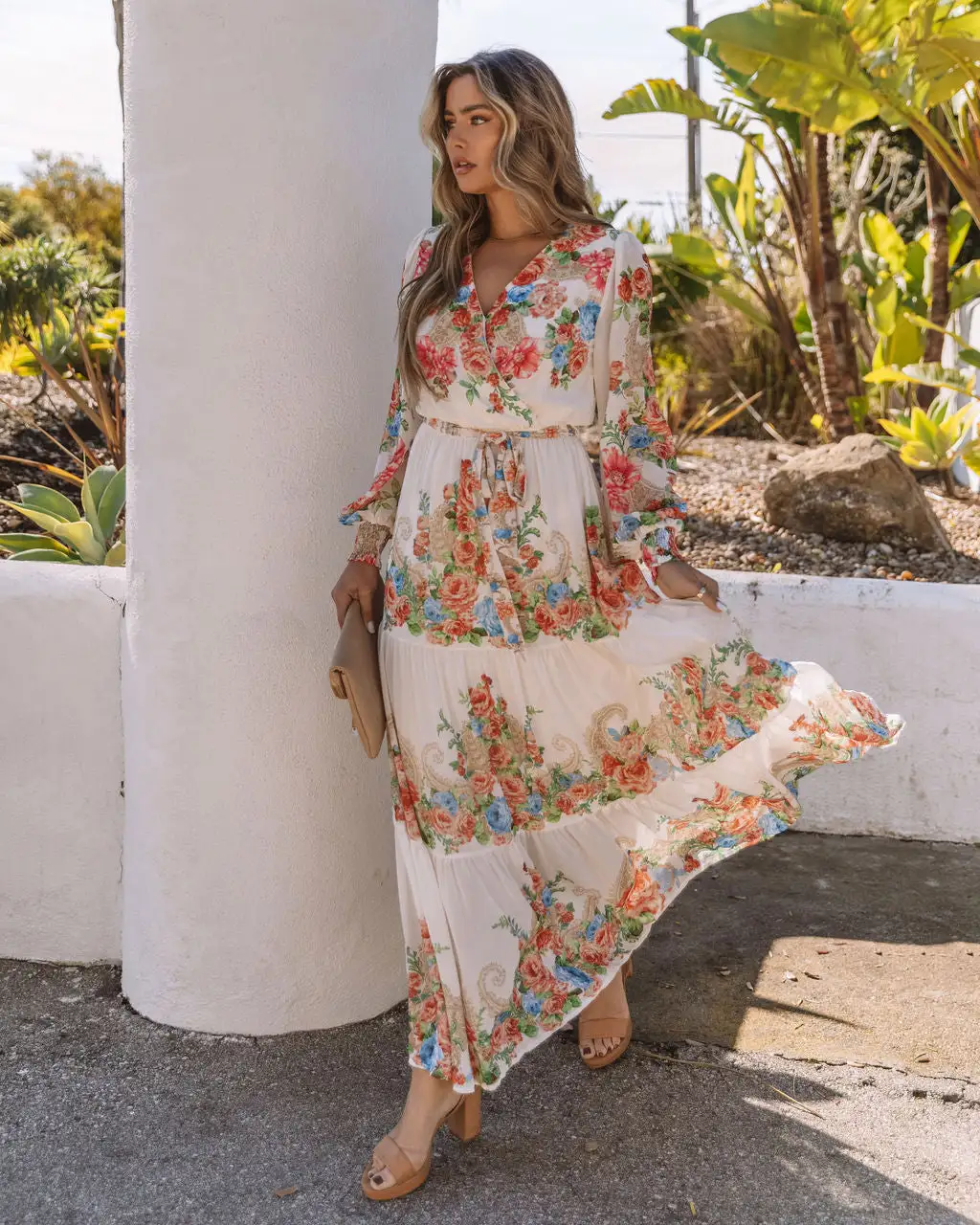 Our Joliet Floral Tiered Maxi Dress is so ethereal! Ivory, olive, blue, rust, pink, and taupe florals detail this maxi. Designed with an adjustable waist tie closure and a draped neckline. Styled with the Minimal Herringbone Necklace, Simple Bangle Bracelet, Stella Crossbody Envelope Zip Clutch, and Go On Faux Leather Heeled Platform Sandal.