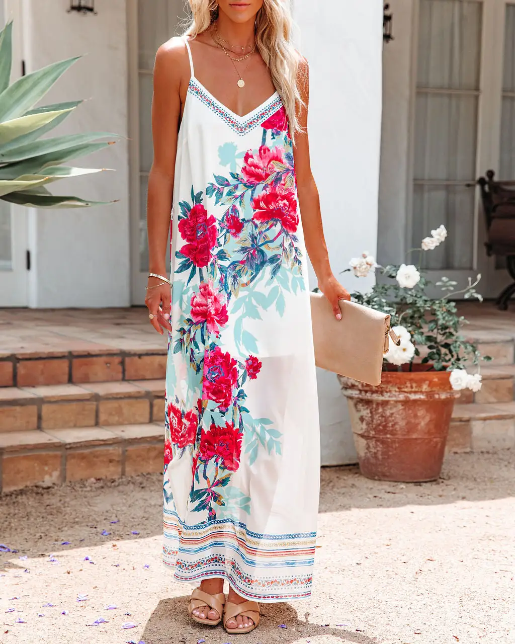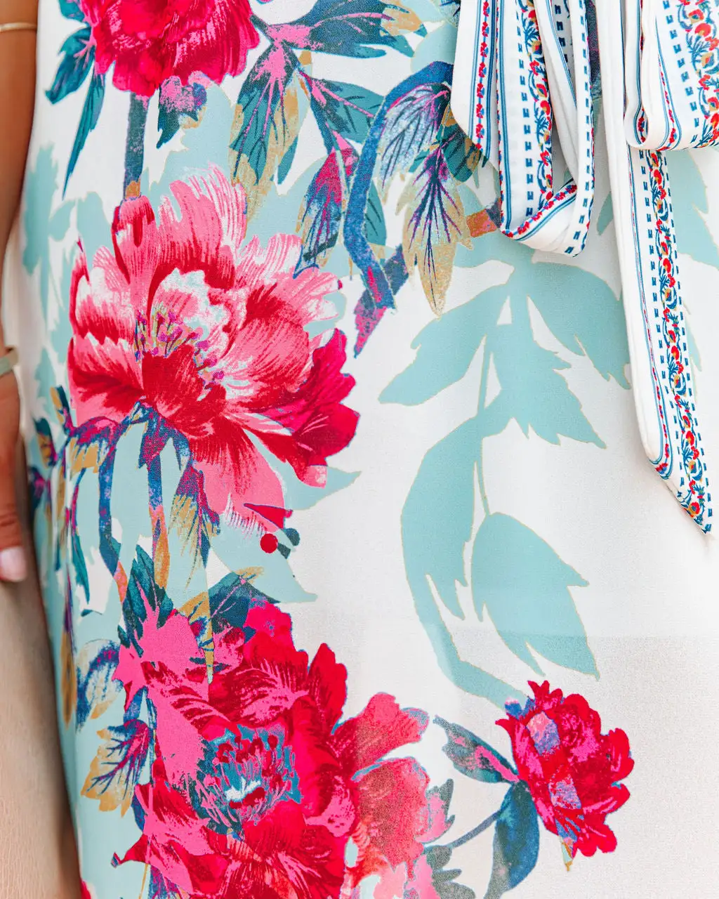 //Best Seller// New Color// Our Take Me To Paradise Printed Maxi Dress is the perfect companion to take on your next vacay! We cannot get enough of this gorgeous ivory hue with mint, lime, yellow, pink, wine, navy, and hunter green florals. The relaxed fit, adjustable spaghetti straps, belted waist, and side slits provide the perfect fit. Styled with the Zoey Hoops, 5 Disc Choker, Chloe Mini Necklace, Flower Coin Necklace, Simple Bangle Bracelet, Stella Crossbody Envelope Zip Clutch, and Twiggy Criss Cross Heeled Sandal.