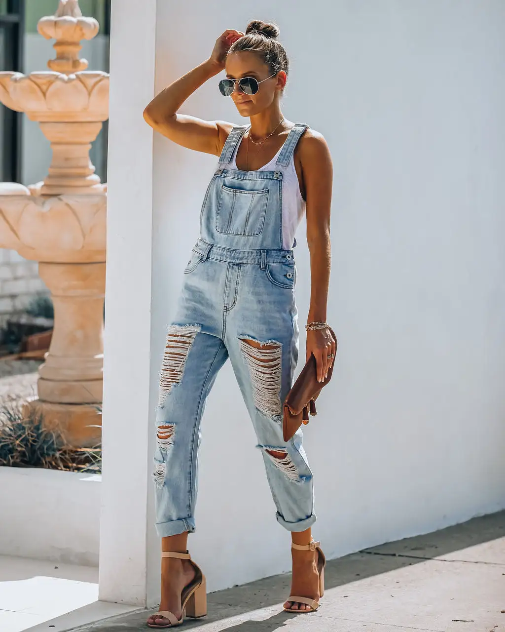 //Best Seller// Show us your sweet + sassy sides in our favorite denim overalls! Our Sassy Sweetheart Distressed Denim Overalls are simple and chic in a medium wash with heavy distressing throughout. We love the relaxed fit on these overalls that will be a staple in your wardrobe! Finished with a front pouch pocket and four more pockets. Styled with the Chloe Mini Necklace, The Buddha Wheel Necklace, Kelsey Chain Bracelet, Physique Racerback Tank, Larkin Heel and the Stella Crossbody Envelope Zip Clutch.