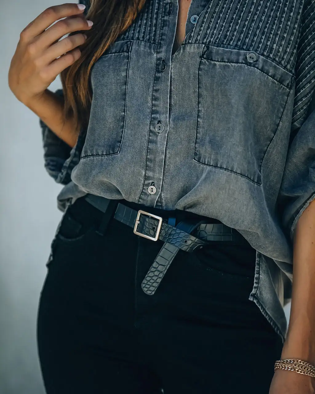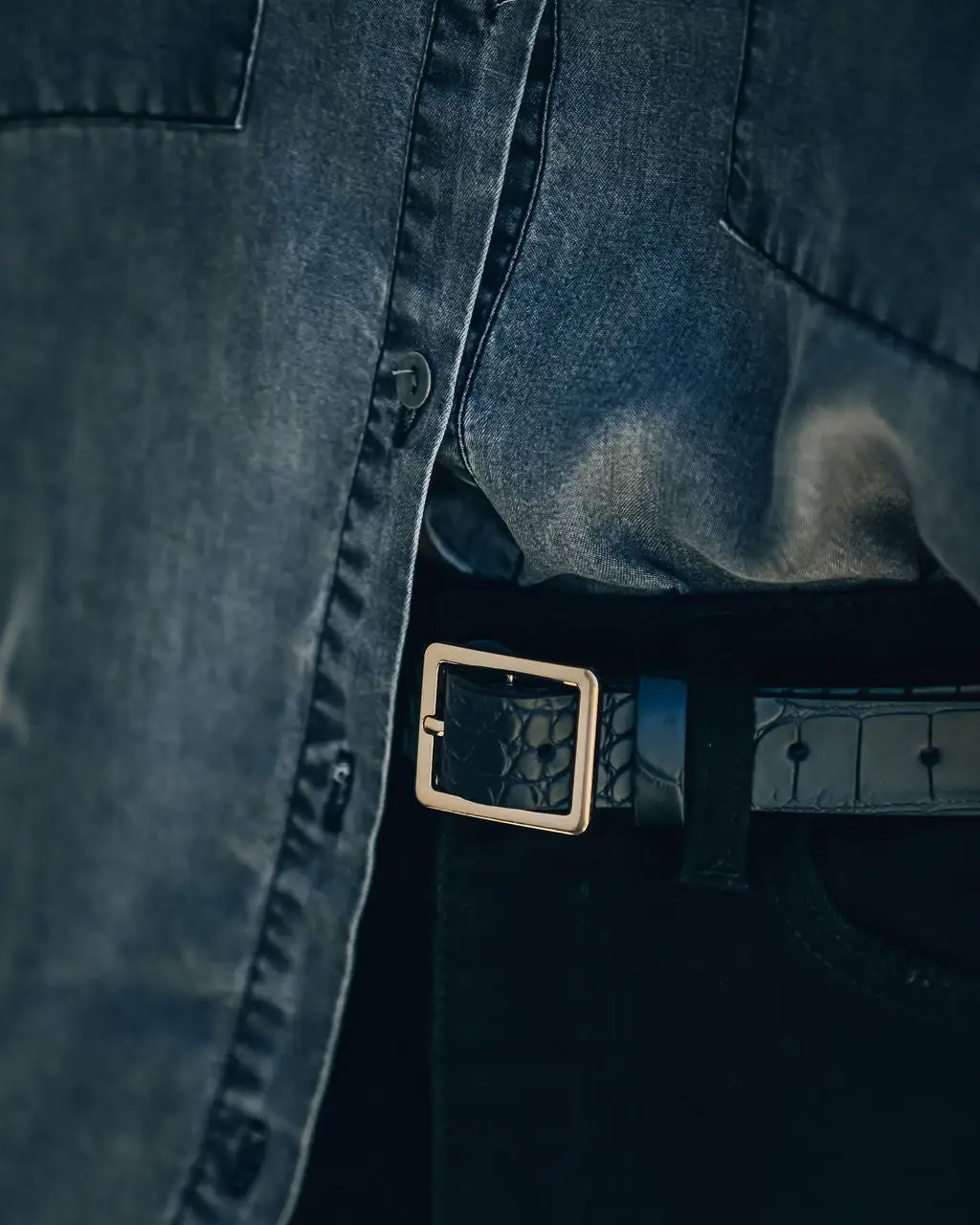 The Jeren Croc Embossed Belt is the perfect accessory to finish your look! Black faux leather embossed croc shapes this cute, minimalist belt with a shiny gold square buckle.