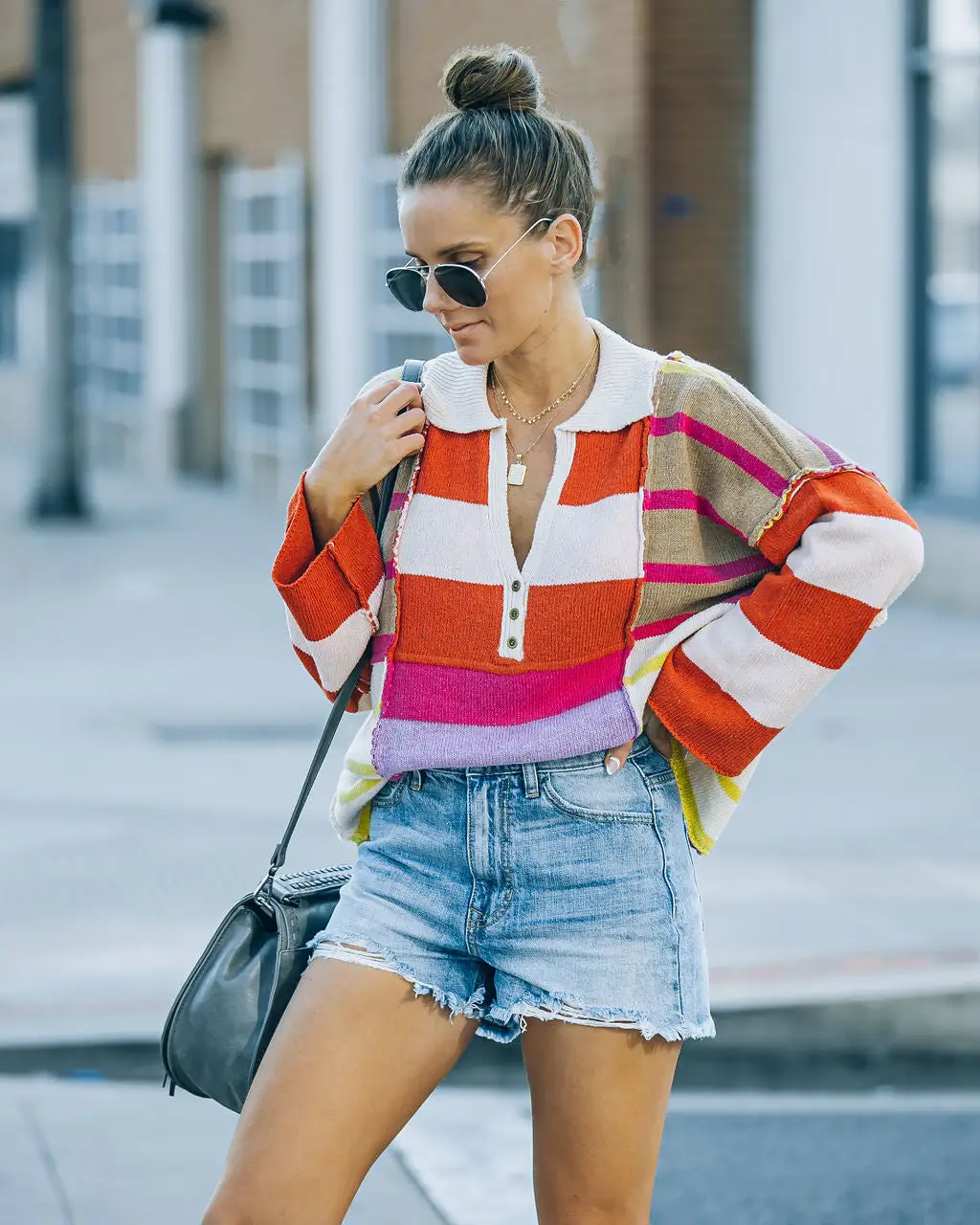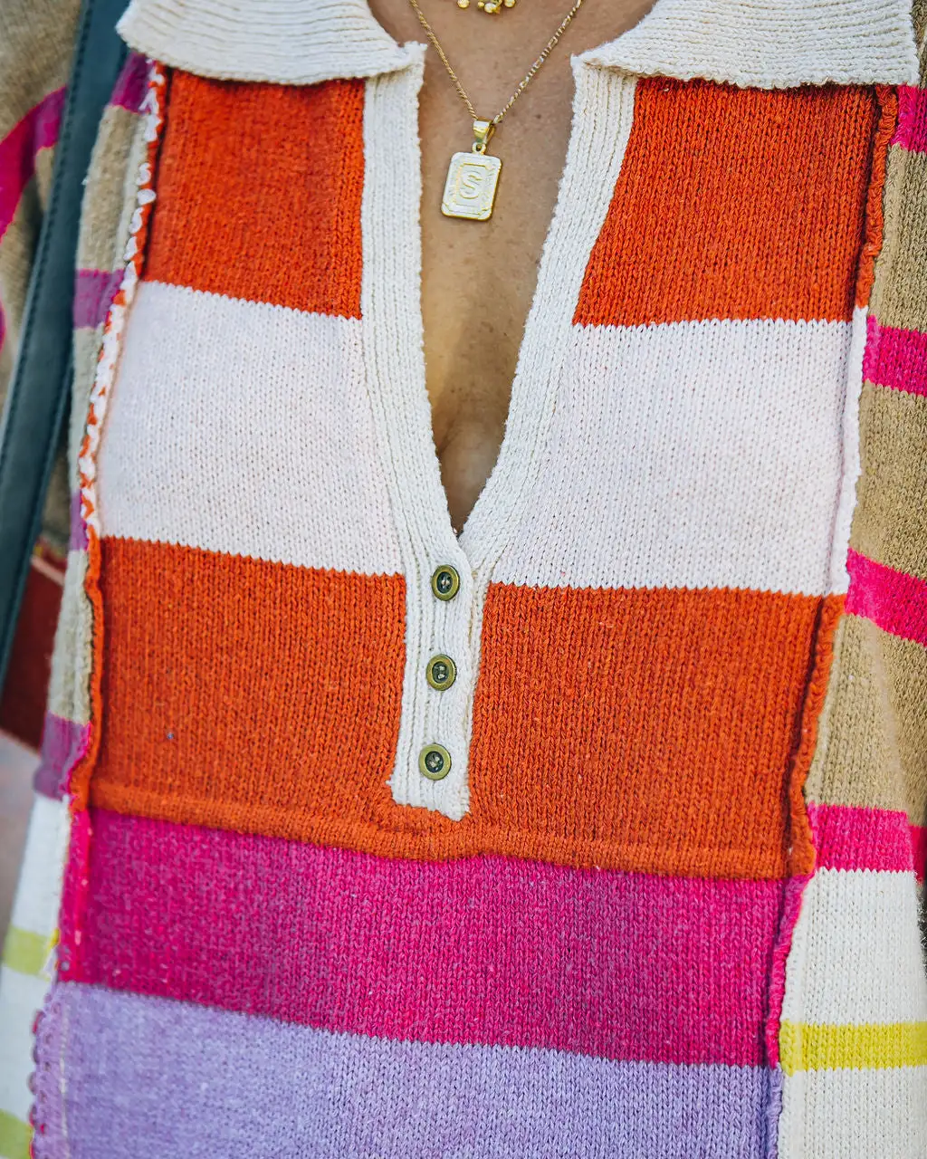 Our Shaw Striped Collared Henley Sweater will put a smile on your face! Oatmeal, rust, magenta, lavender, yellow, and tan stripes detail this sweater. Finished with henley button closures. Styled with the Chloe Mini Necklace, Initial Card Necklace, Simple Bangle Bracelet, Highland Bag, Hazel High Rise Distressed Denim, and Saint Slouch Boot.