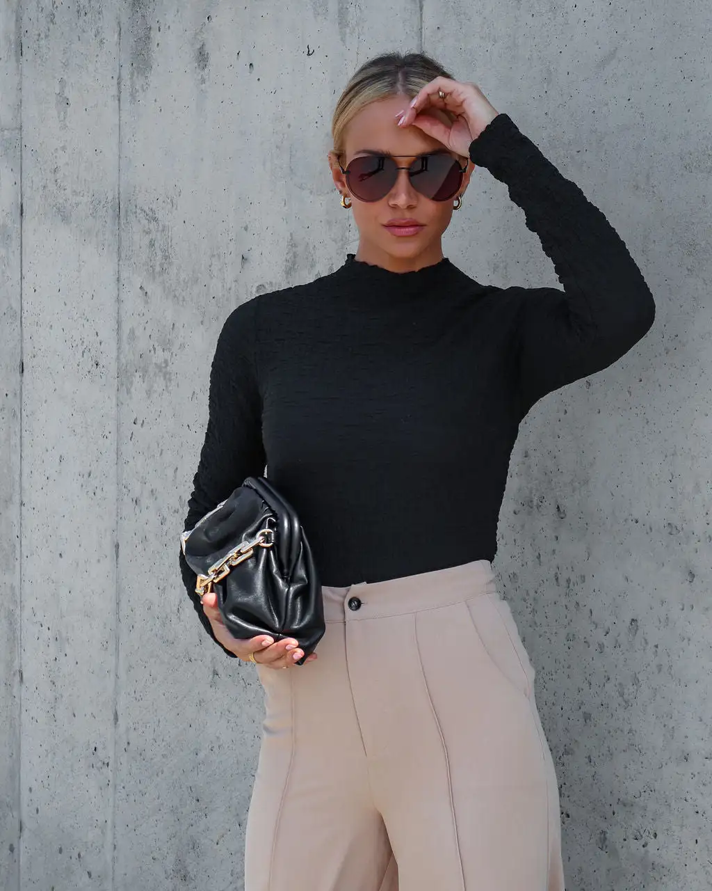 Look cute for GNO in the Korey Textured Long Sleeve Bodysuit in black that features a high neckline.